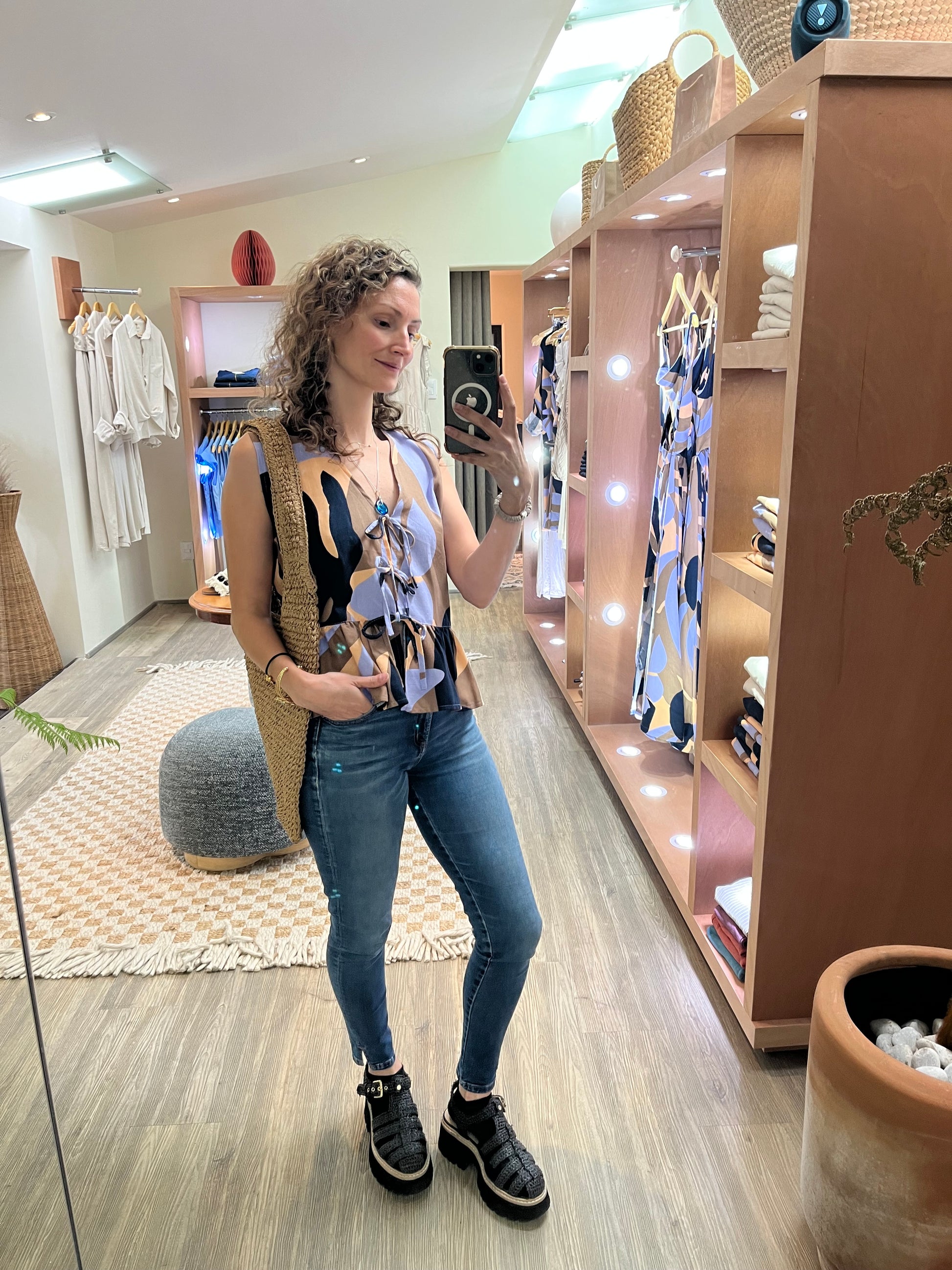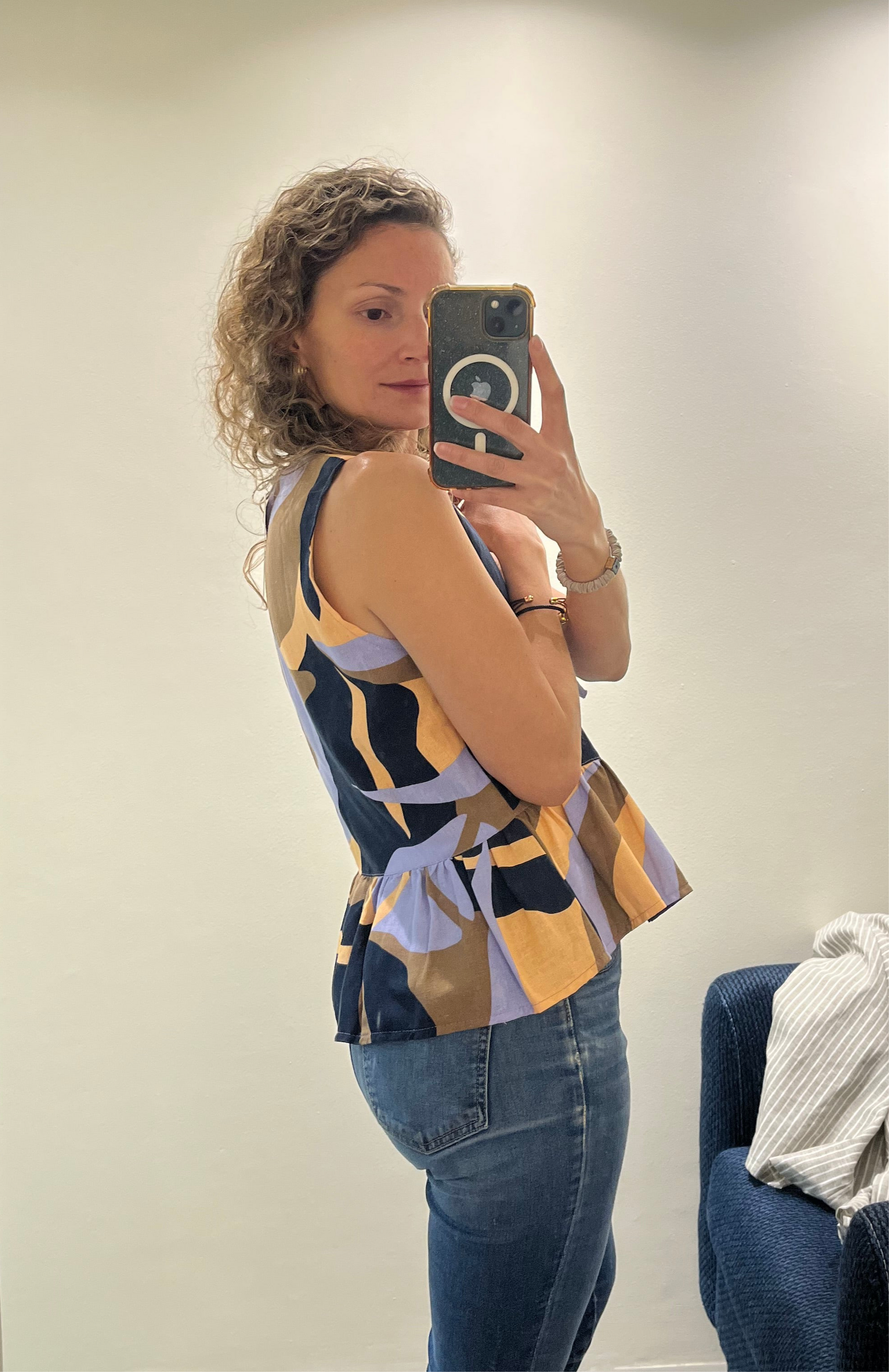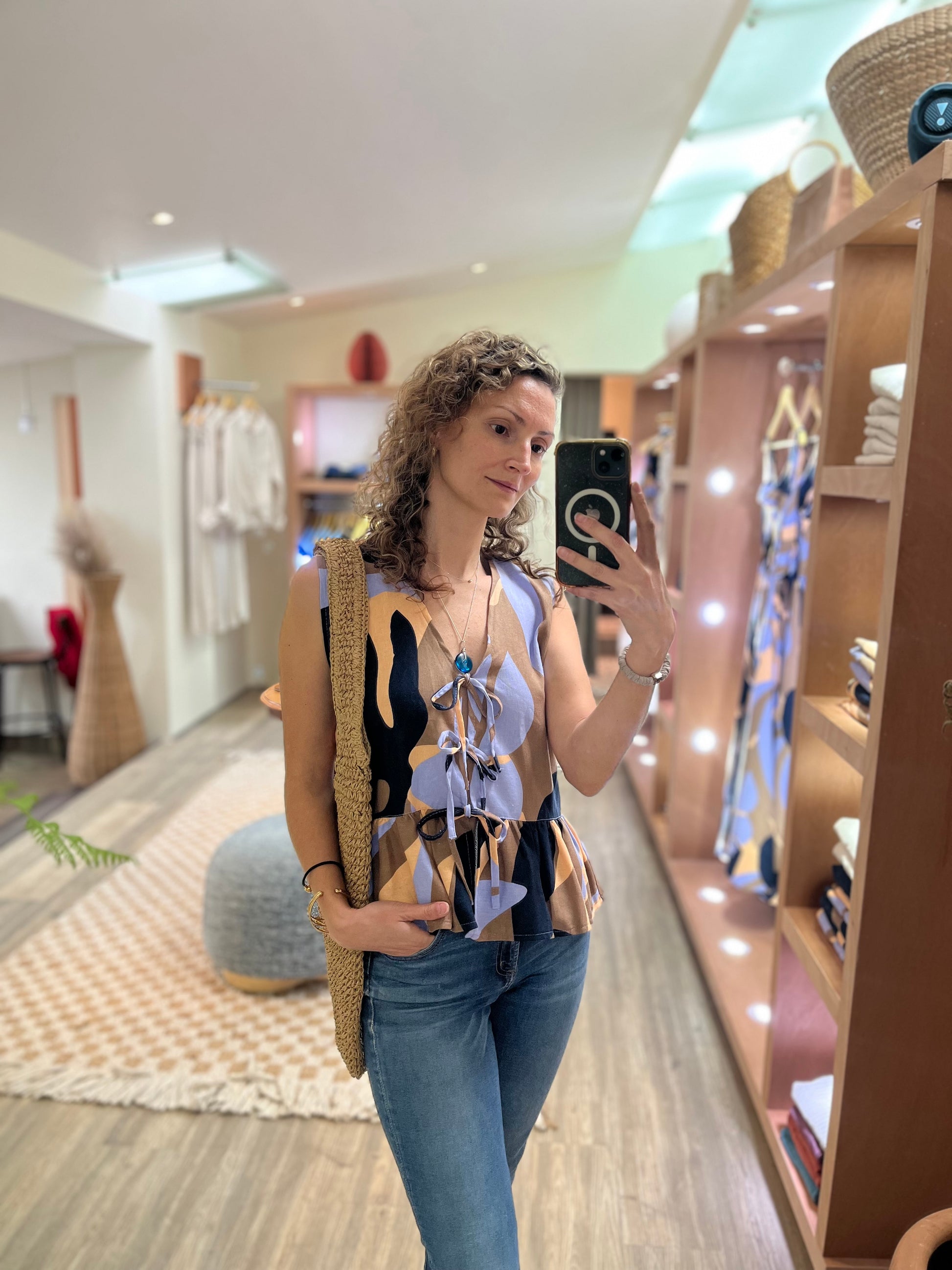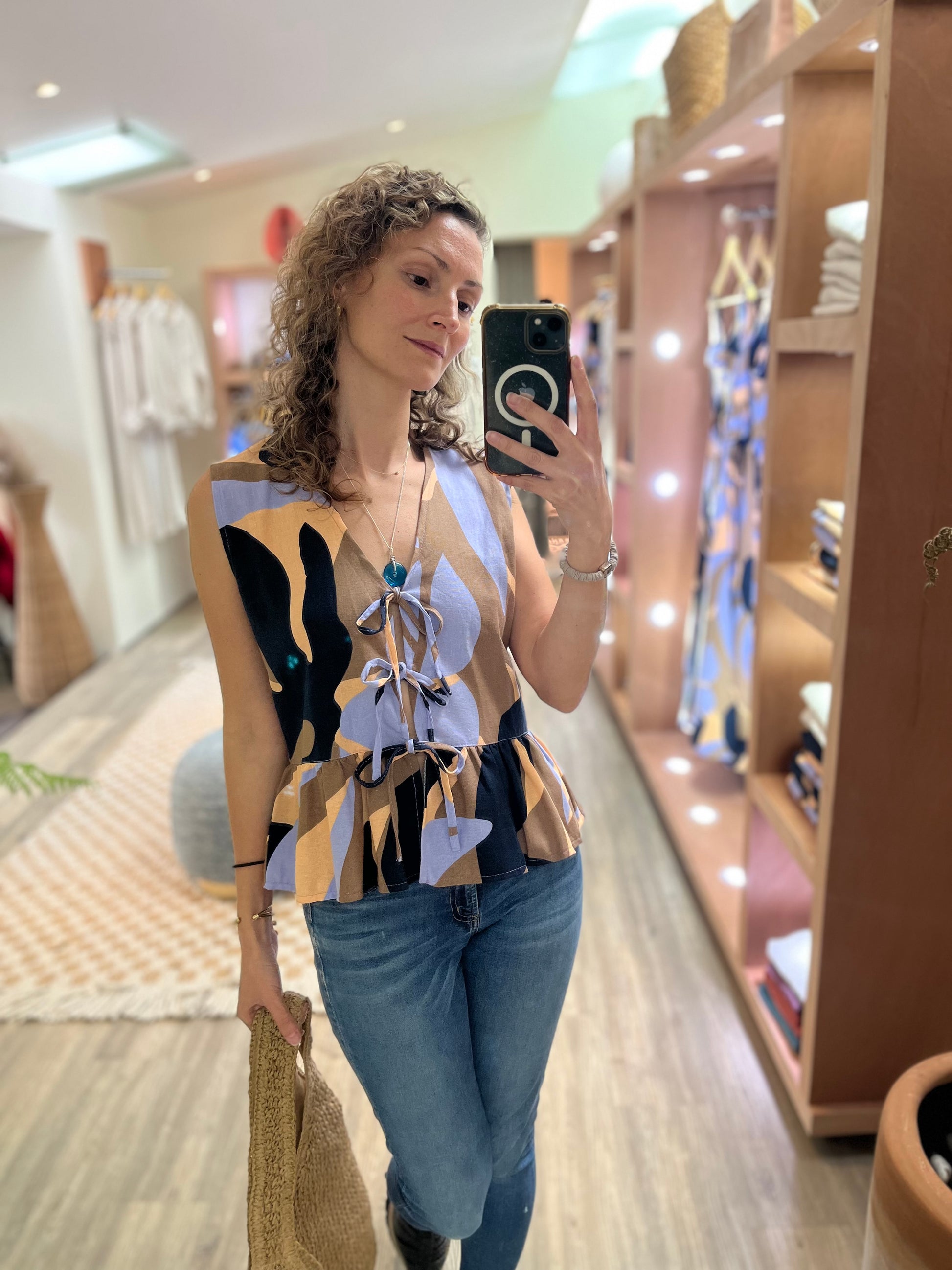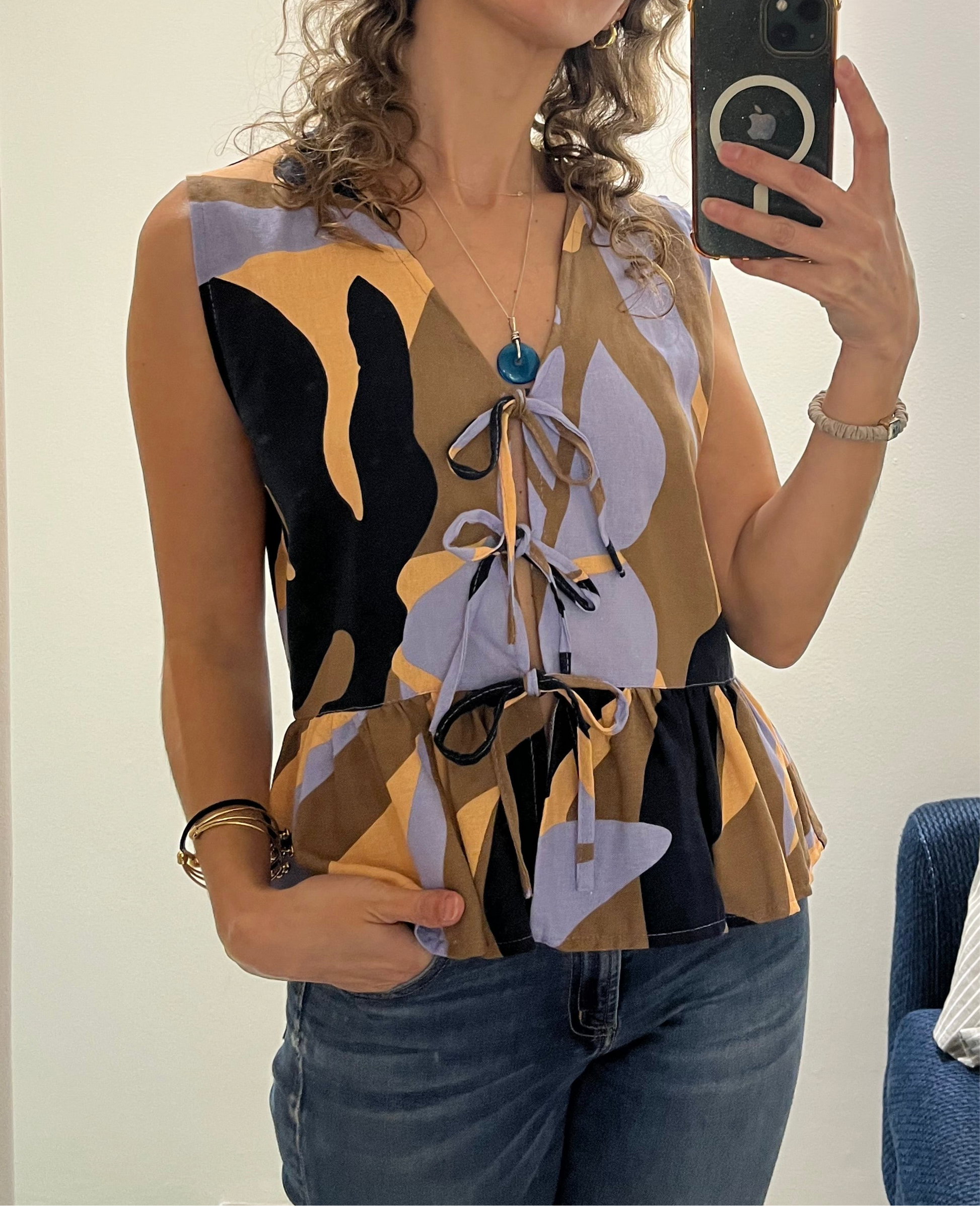 Top tipo chaleco de lino estampado con tiras al frente para amarrar y olan fruncido.
