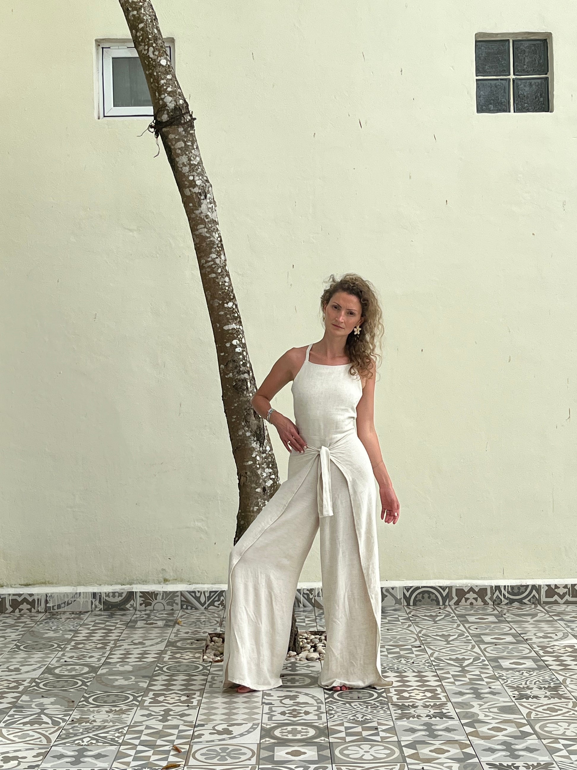 Jumpsuit Macarena, ligero, de espalda cruzada y ajuste del pantalón en la parte delantera. Delicado, femenino y versátil.