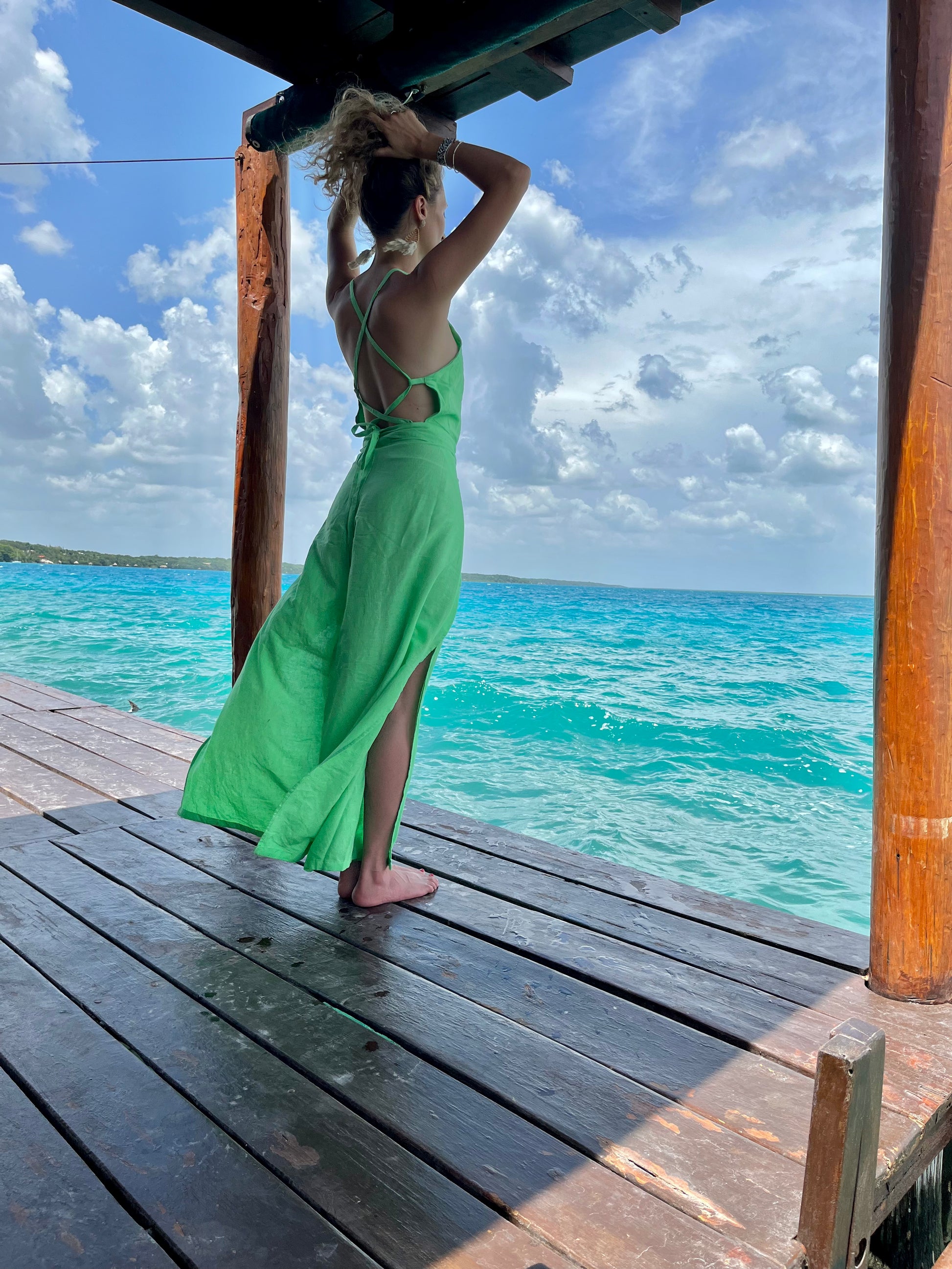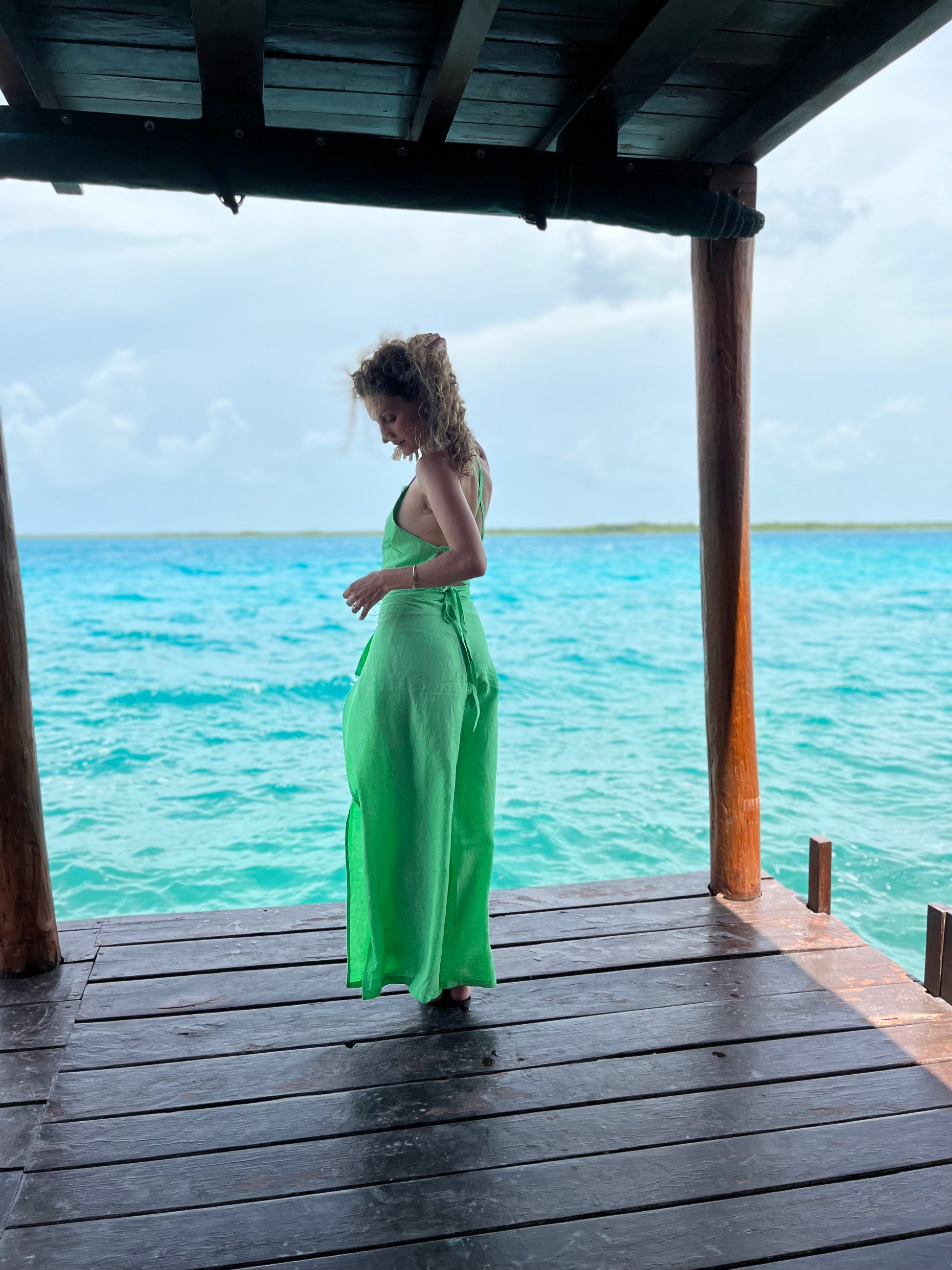 Jumpsuit envolvente de lino en color verde lima, con ajuste en espalda y cinto al frente. Doble capa en la parte del top para más confort, no transparenta.