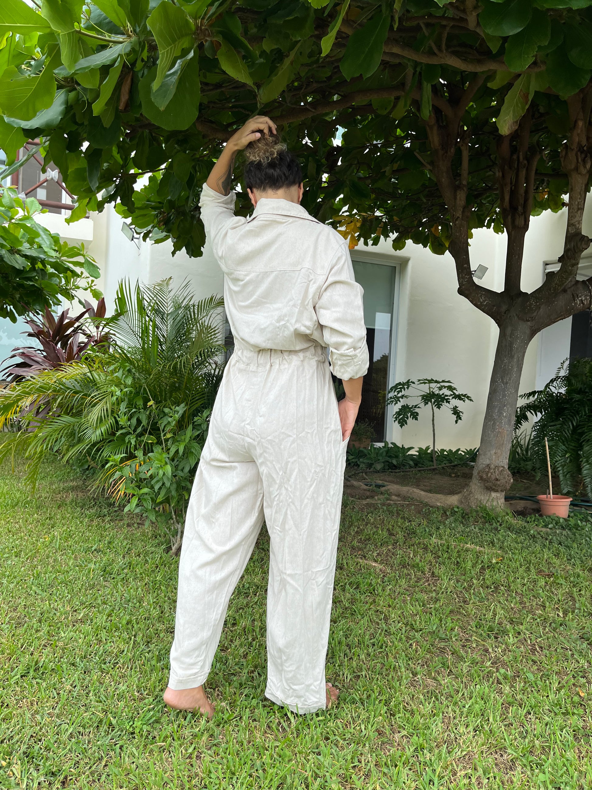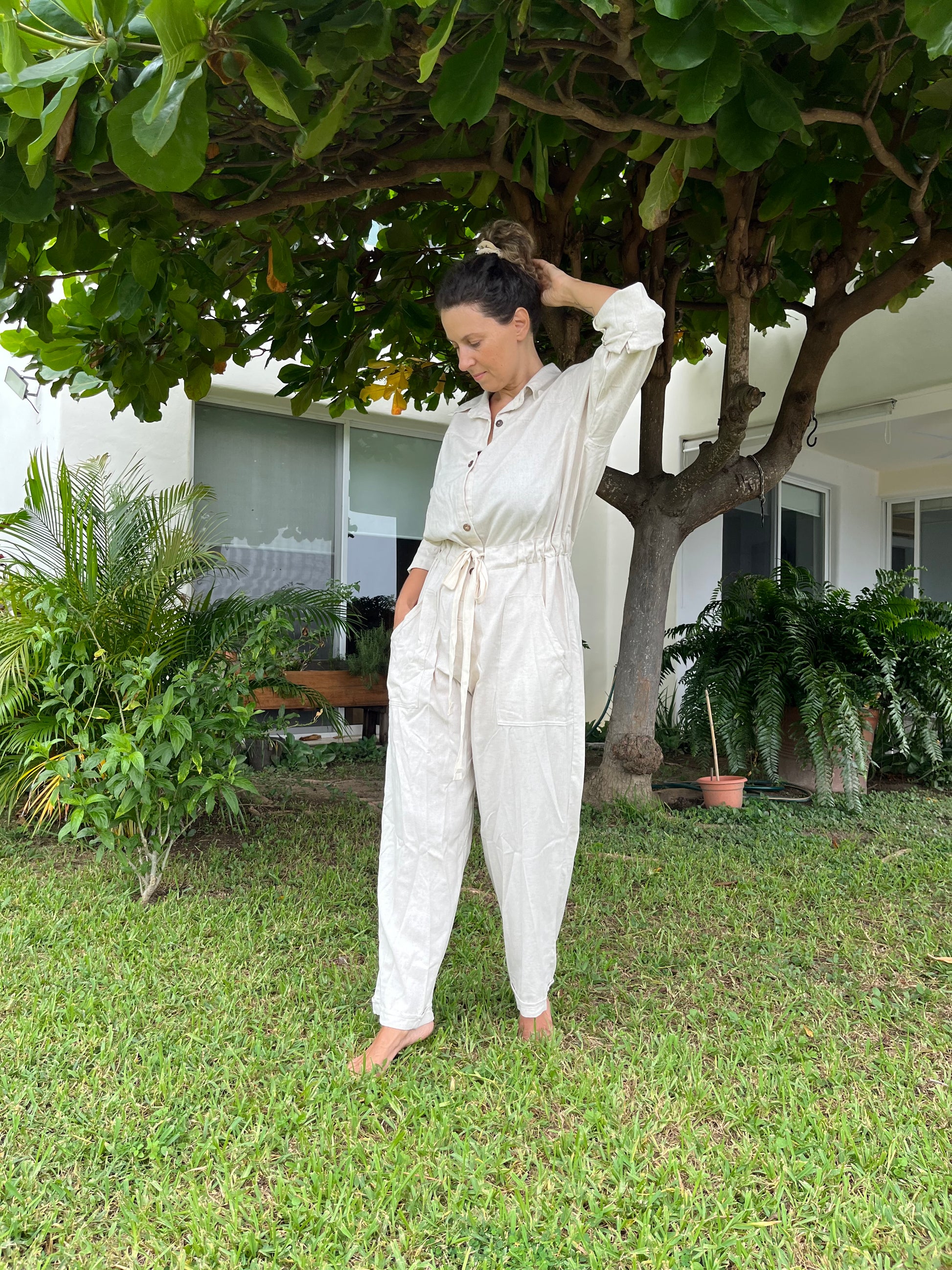 Overol de lino en color crudo natural, con mangas largas y botones de coco. Ajustable a la cintura, súper cómodo y fresco.