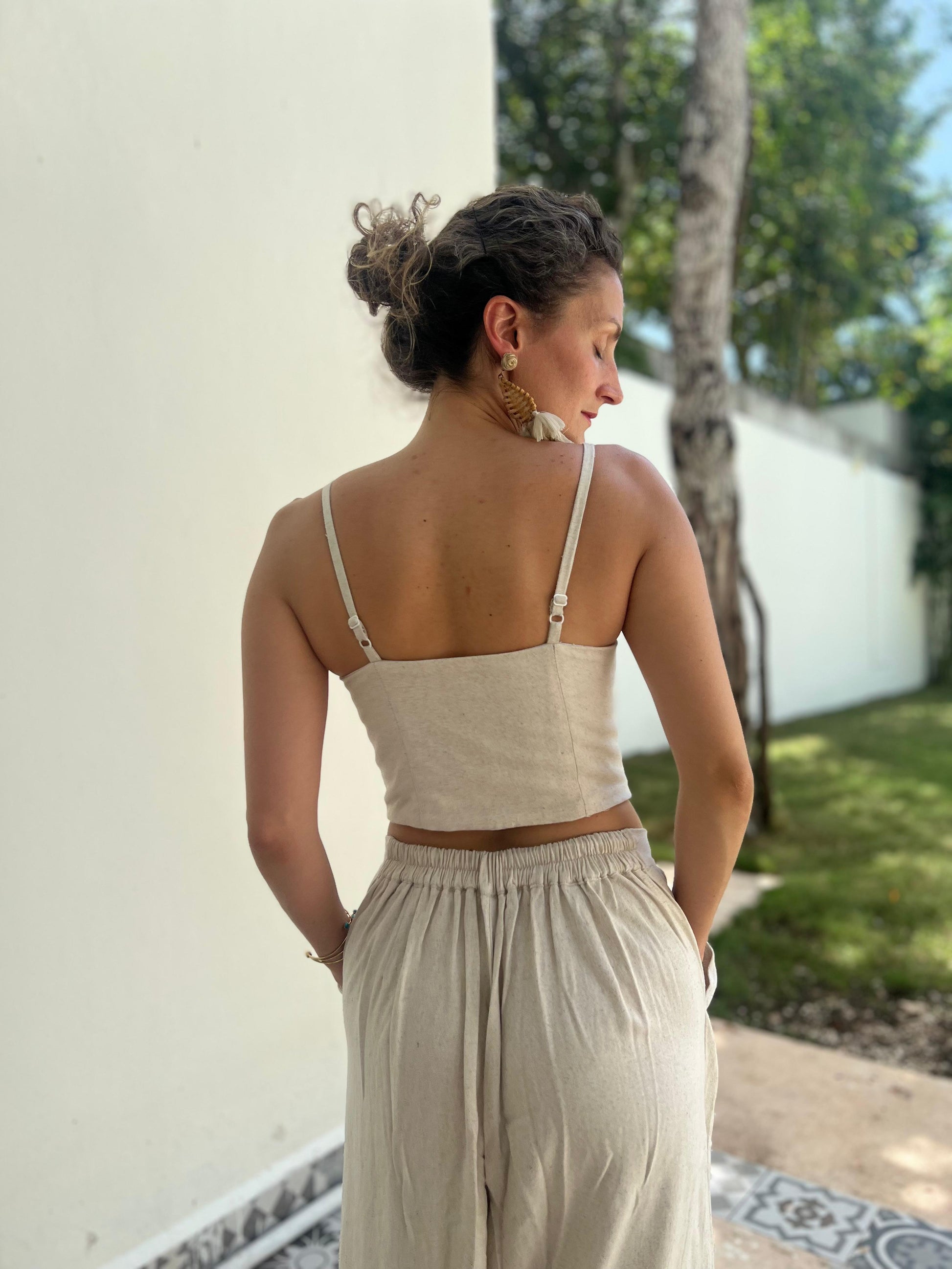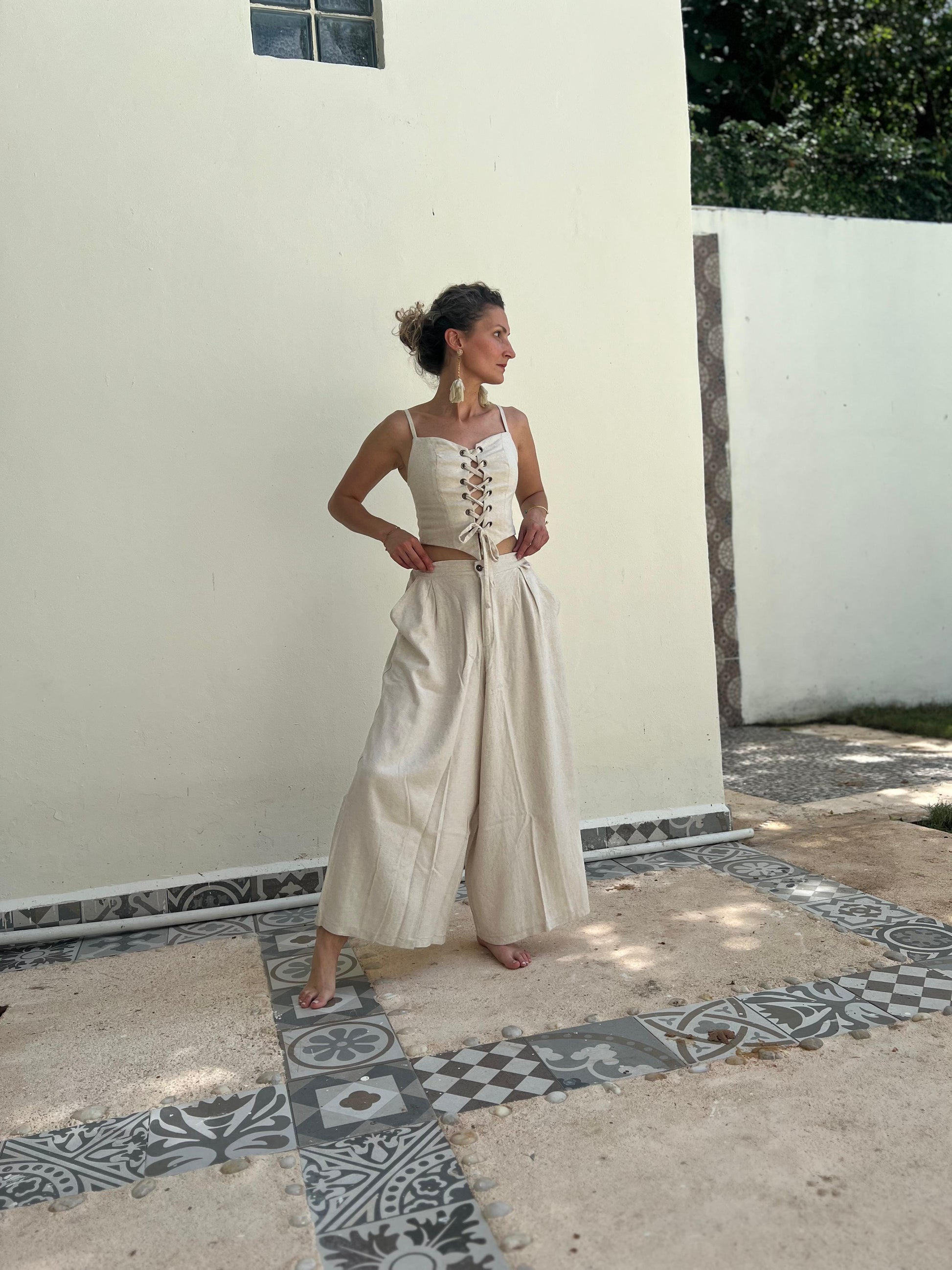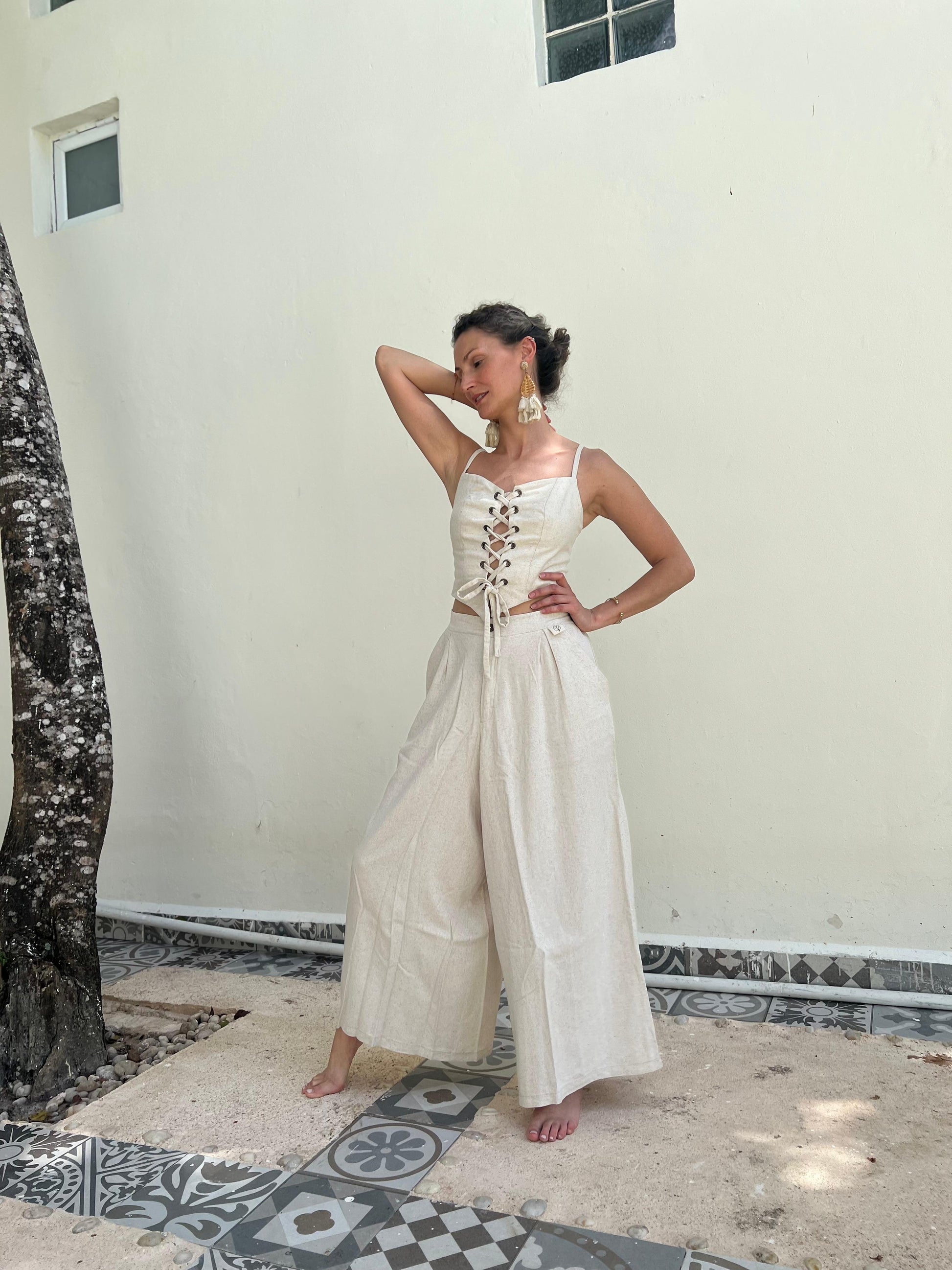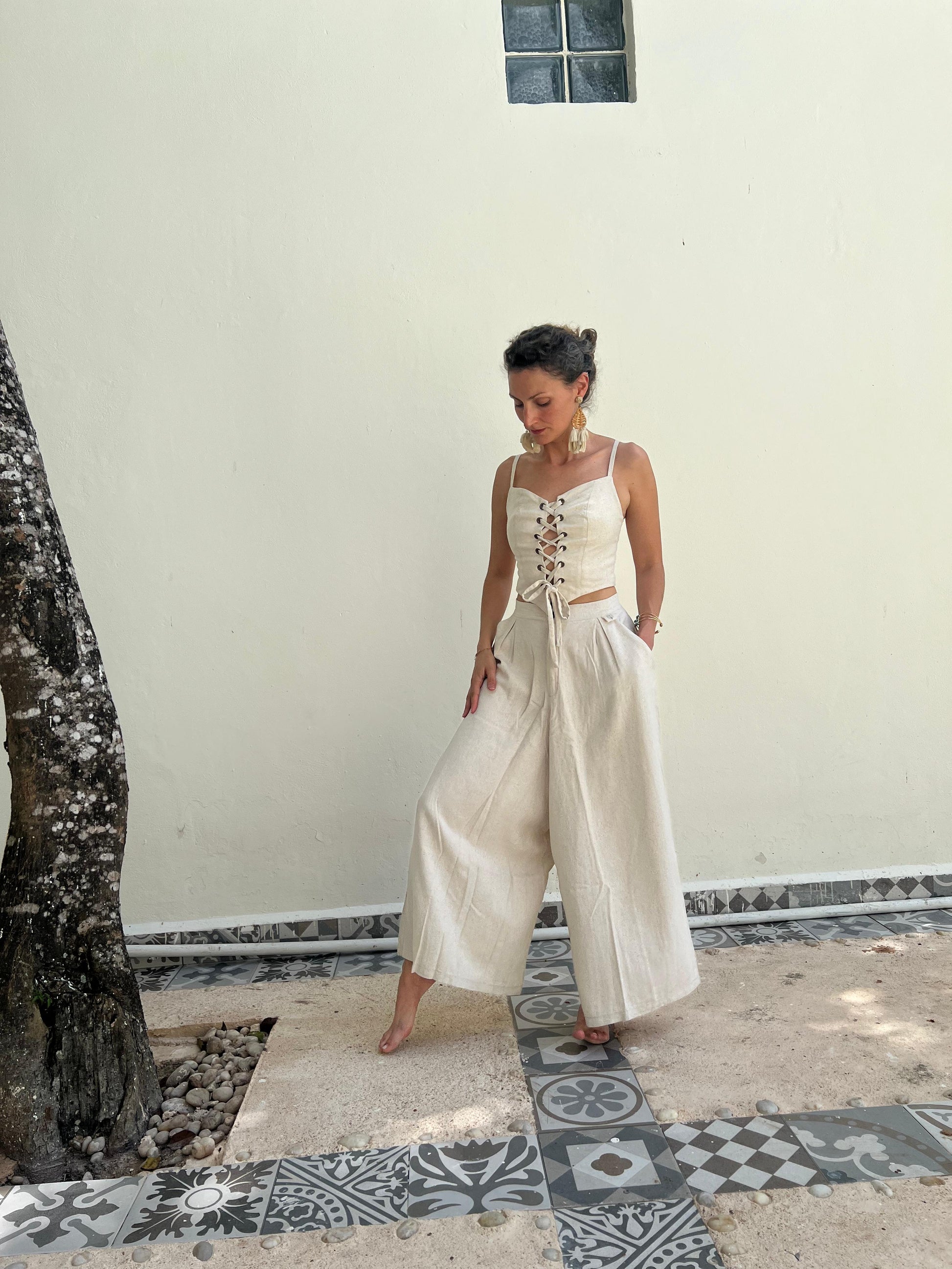 Pantalón pinzado, amplio, con cierre y botón al frente, una opción cómoda y versátil para usar donde quieras. De textura suave y fresca por estar confeccionado en lino.