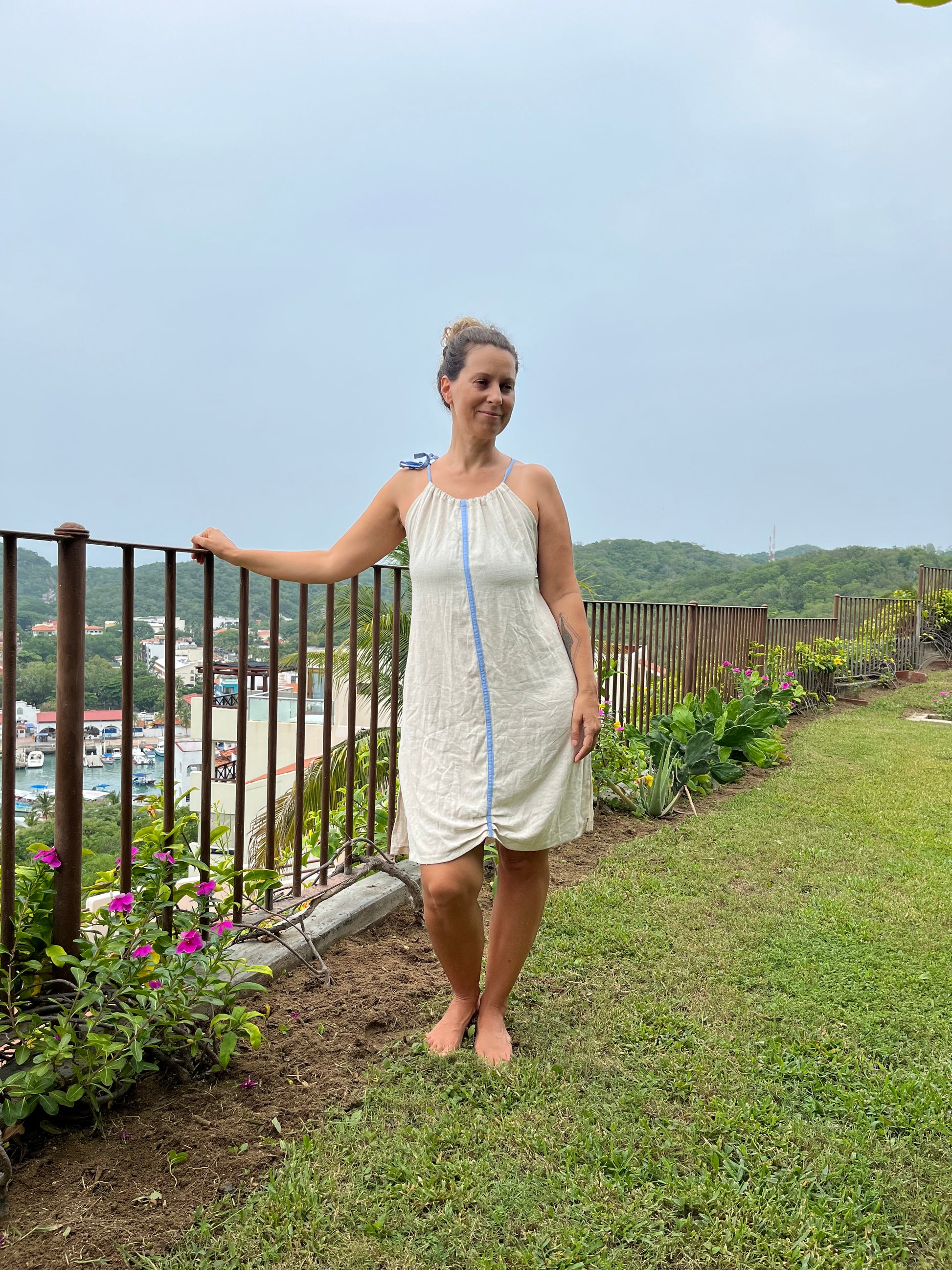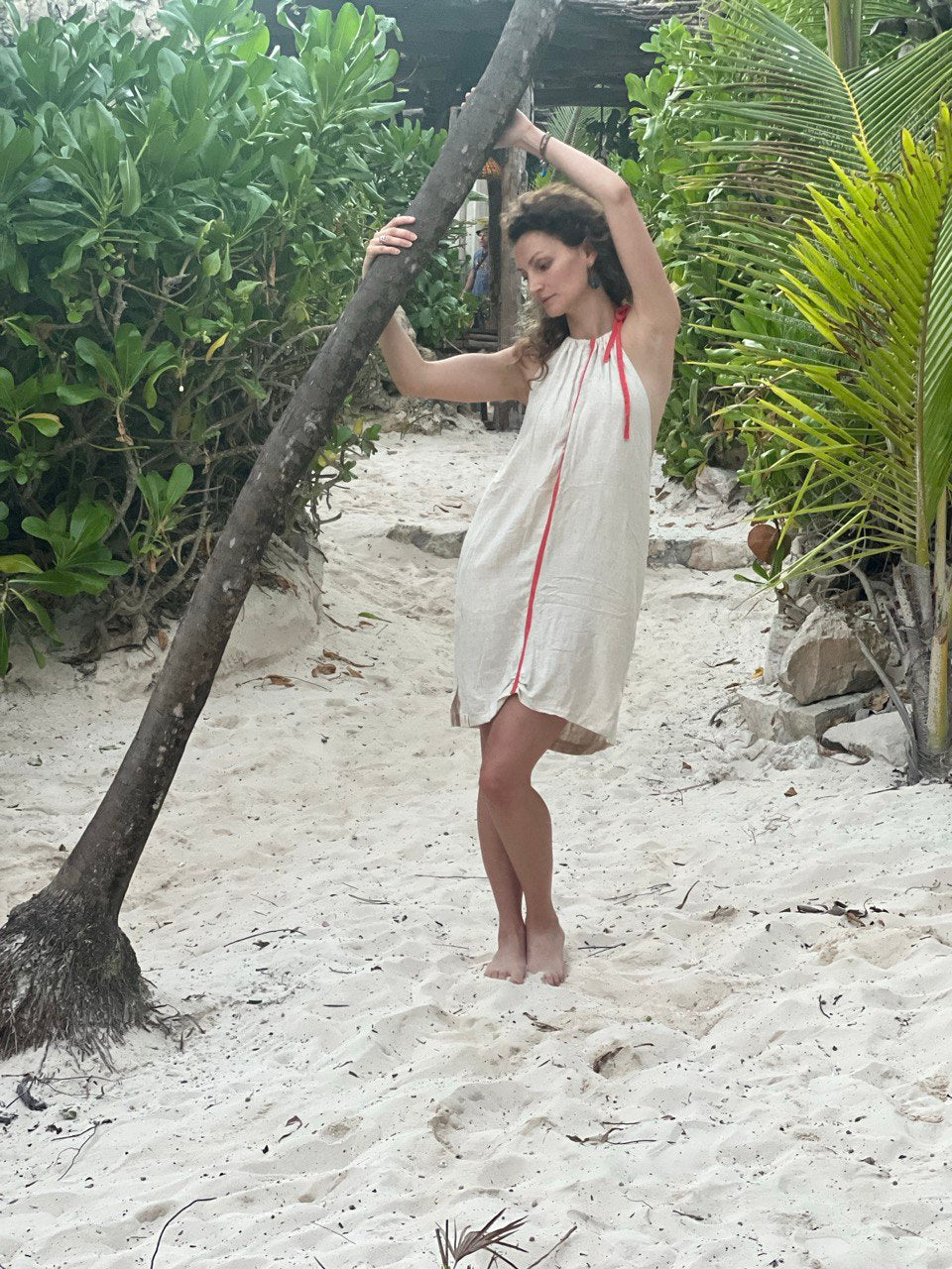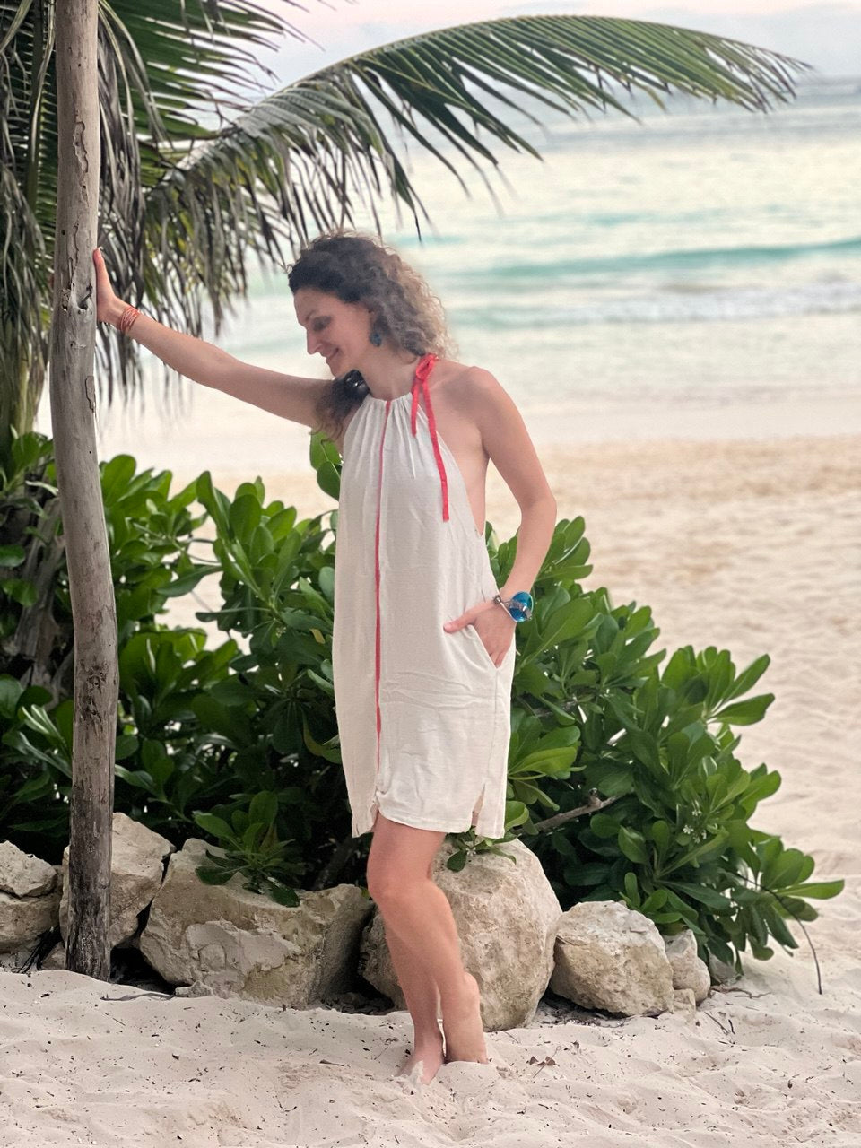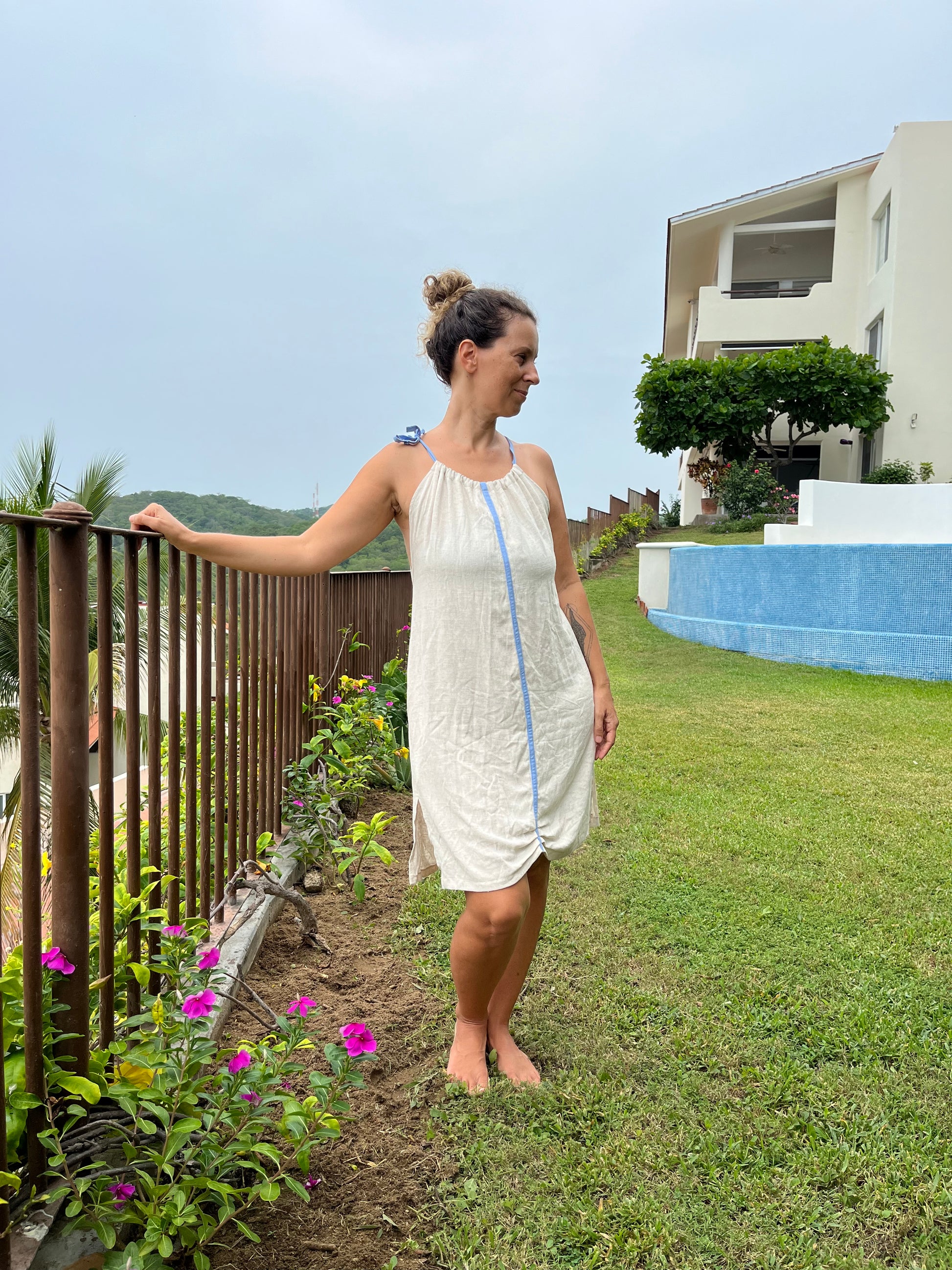 Vestido corto de lino color natural con detalle de color en el centro, puede ser color coral o azul claro. Amplio, con escote cruzado en espalda, ajustable en hombros y bolsas a los lados.