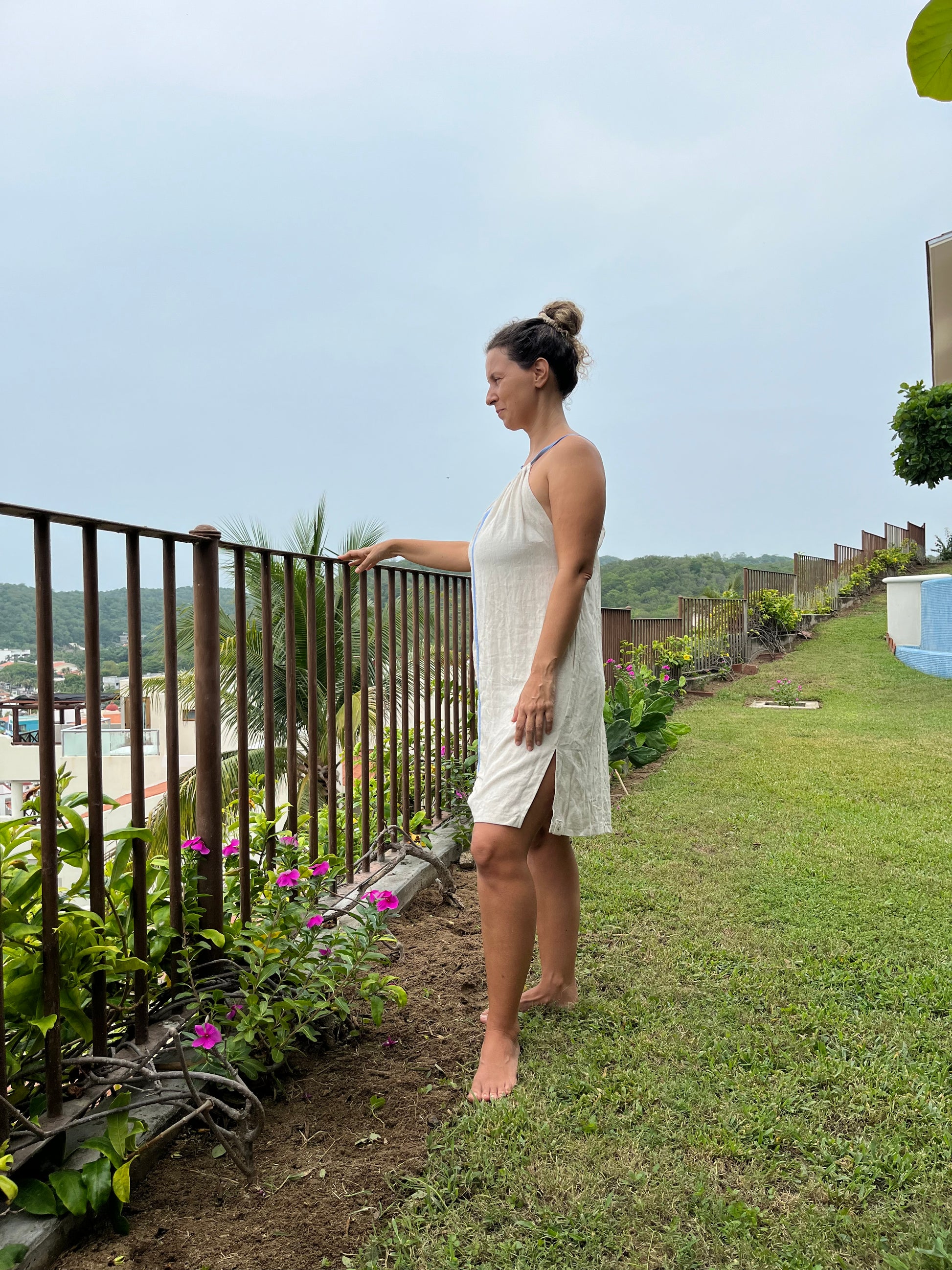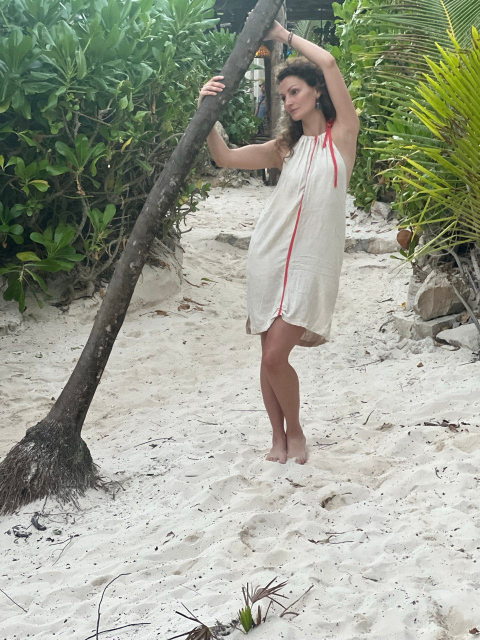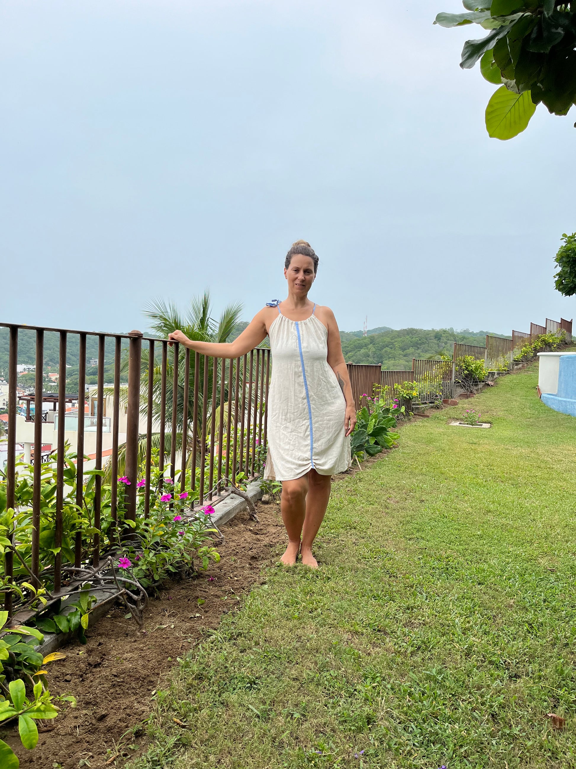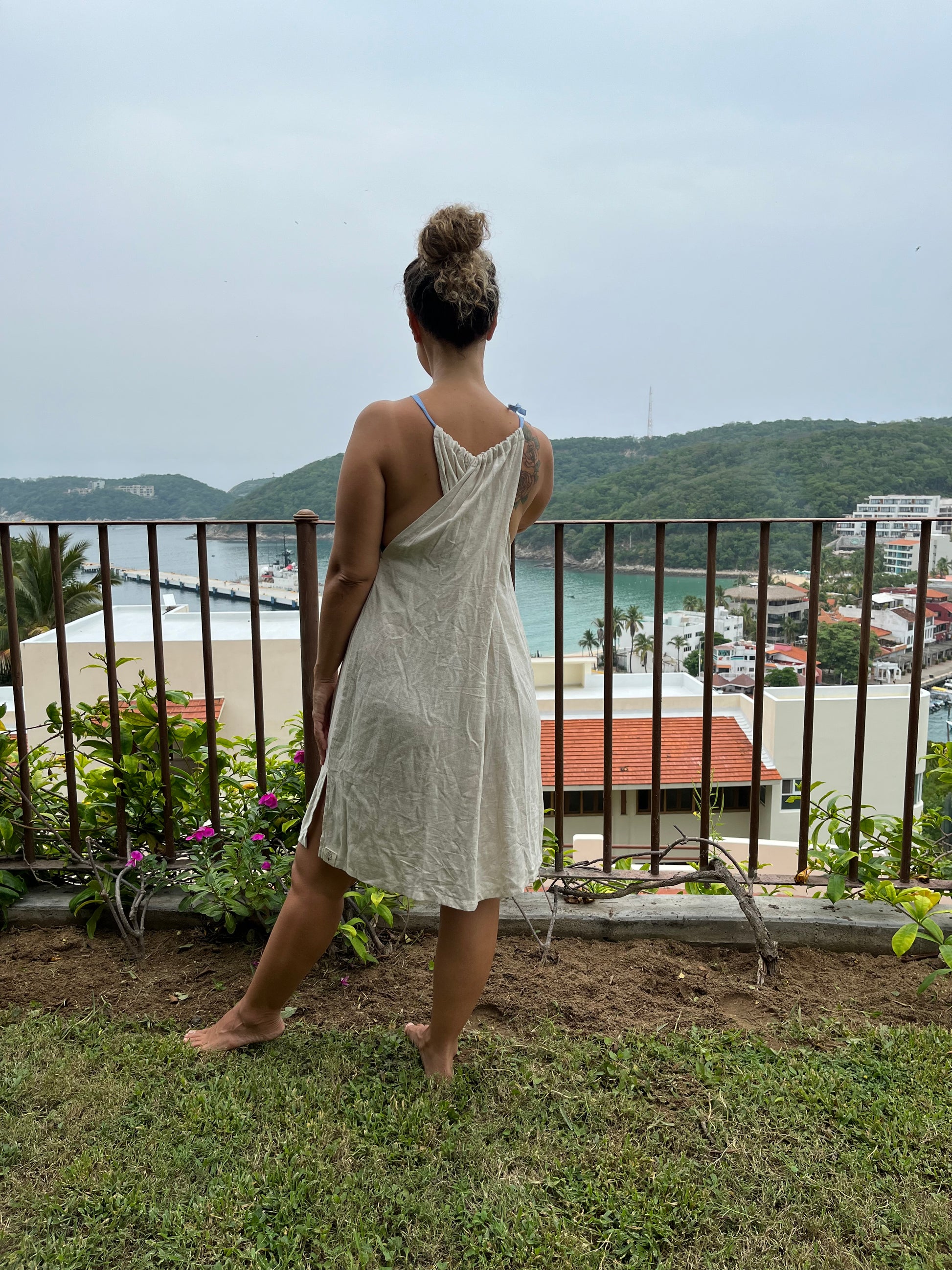 Vestido corto de lino color natural con detalle de color en el centro, puede ser color coral o azul claro. Amplio, con escote cruzado en espalda, ajustable en hombros y bolsas a los lados.