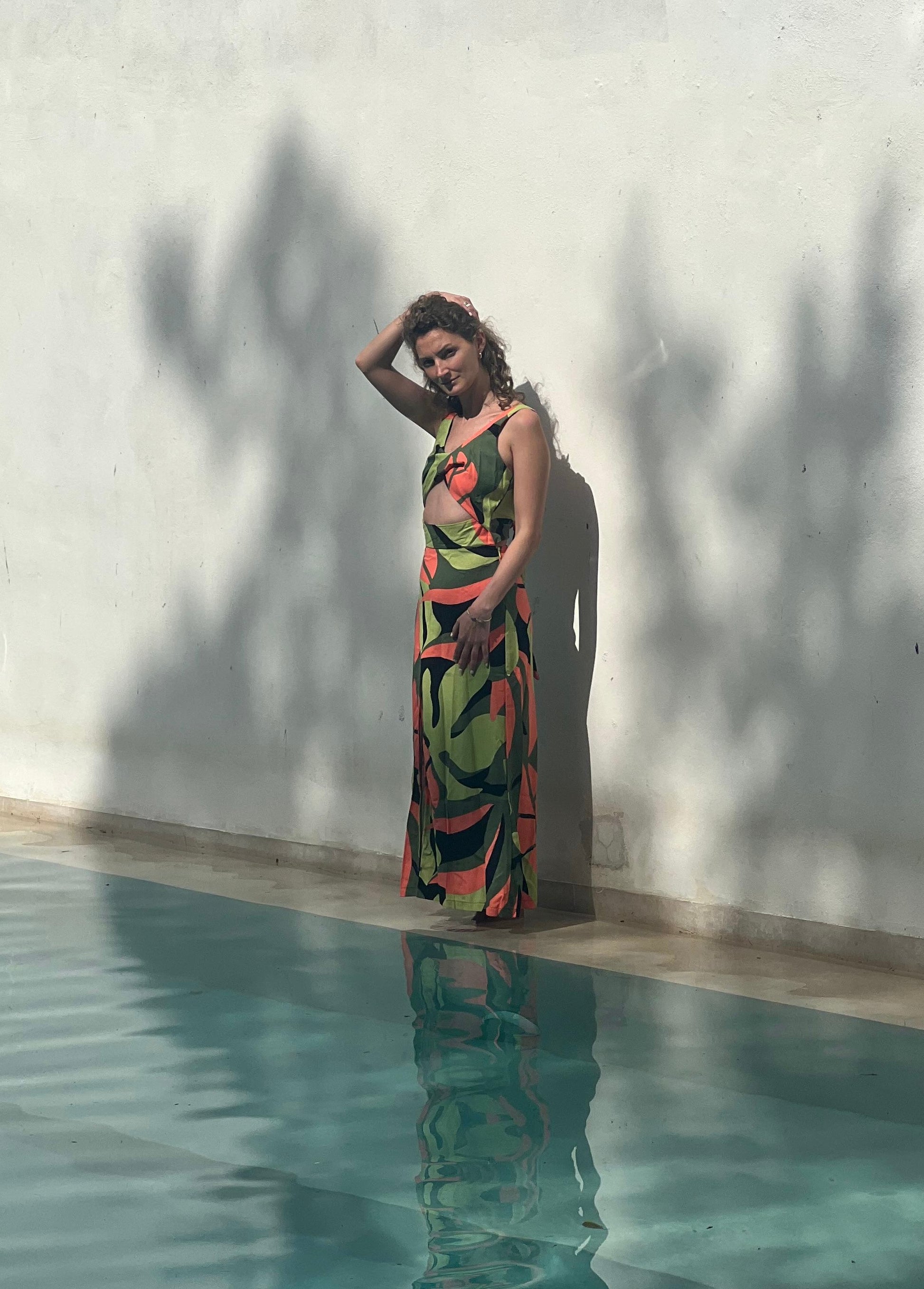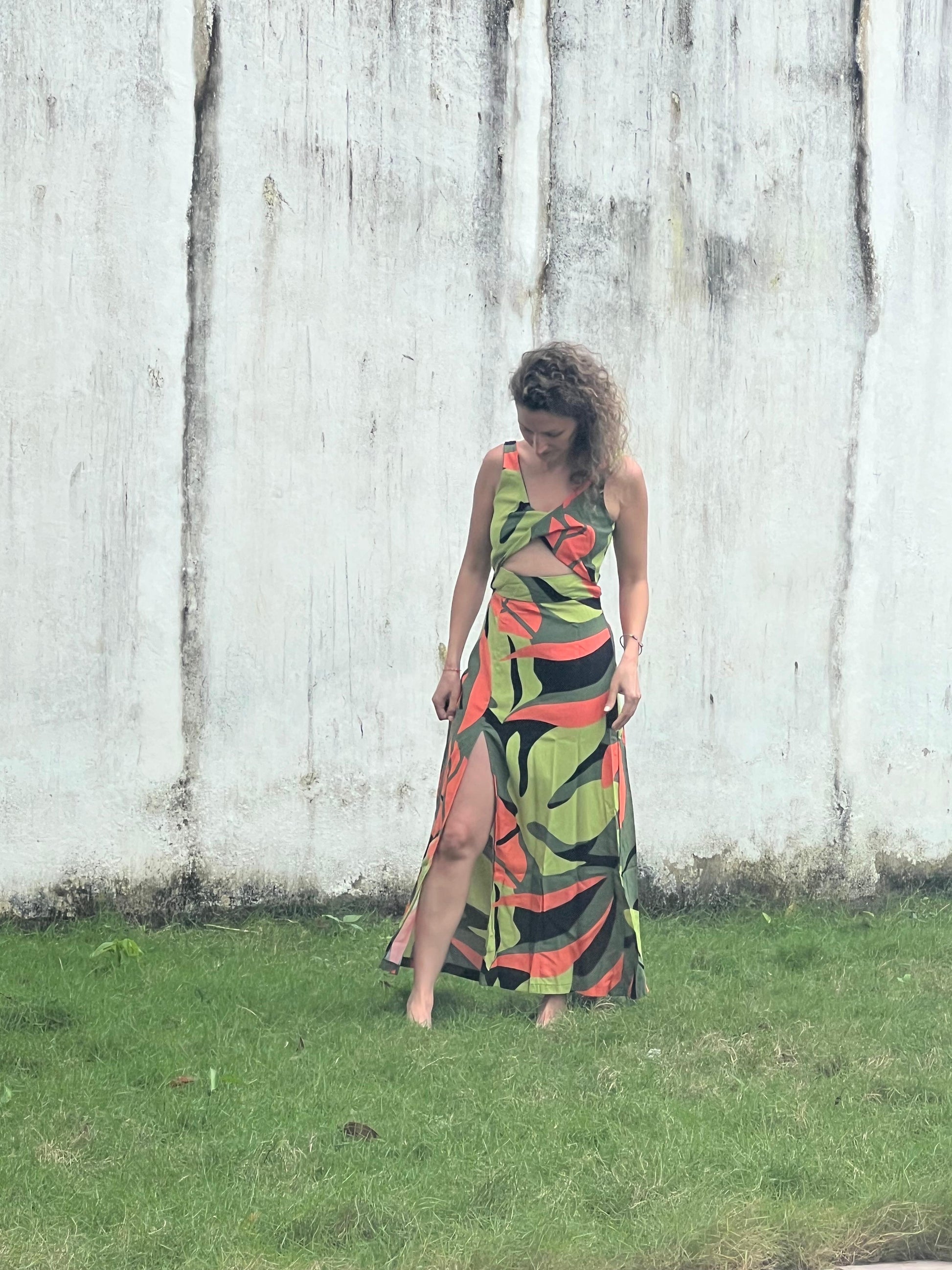 Vestido largo de lino estampado, con escote cruzado y cut out al frente. Se ajusta en la espalda a tu gusto, tiene doble capa para que lo puedas sentirte cómoda al vestirlo sin bra, no transparenta y no se marca.