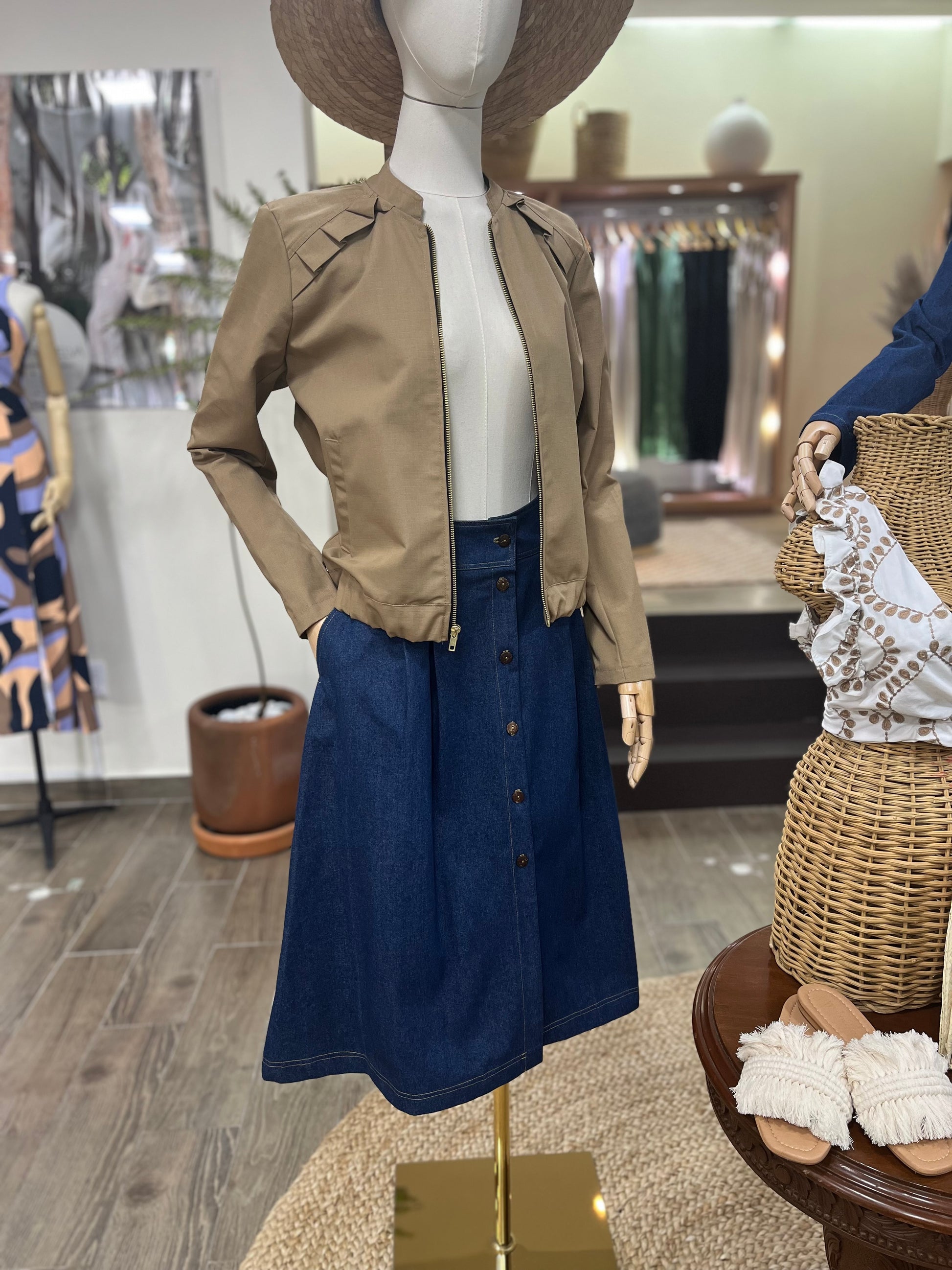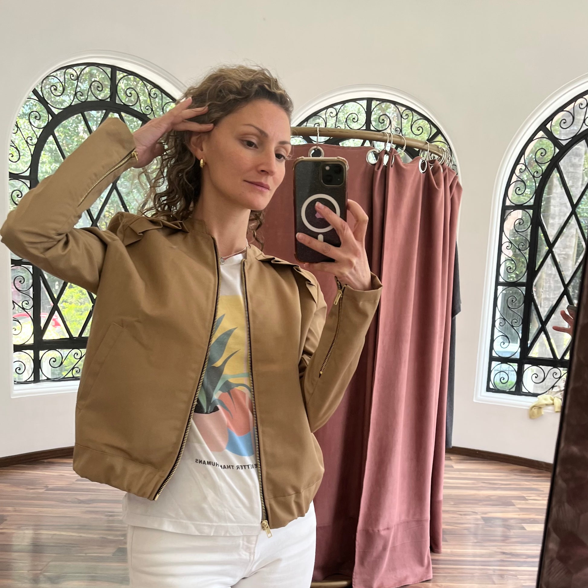 Chamarra tipo bomber de gabardina impermeable con detalle plisado en hombros y espalda, cierre metálico al frente y en puños. Confeccionada en gabardina impermeable 💧