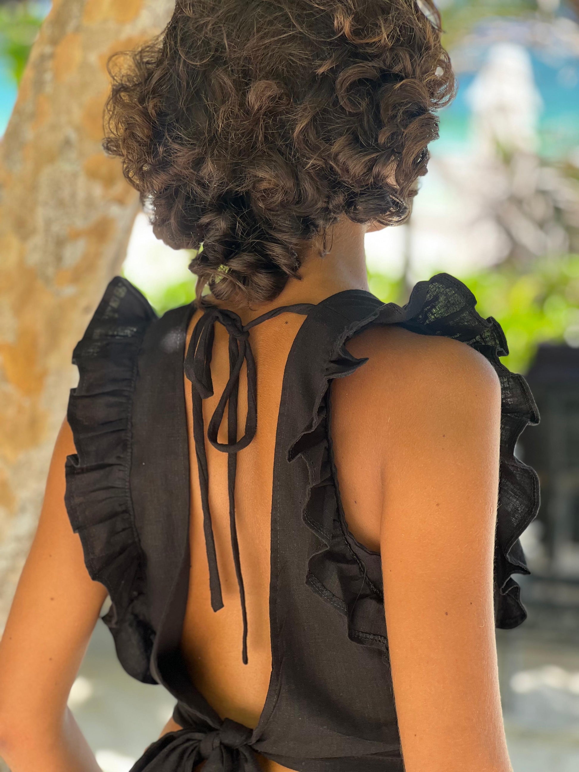 Elaborado en lino, forrado en frente y espalda, por lo que no necesitas utilizar nada debajo, es ajustable en la espalda por lo que se vuelve práctico y cómodo de usar.