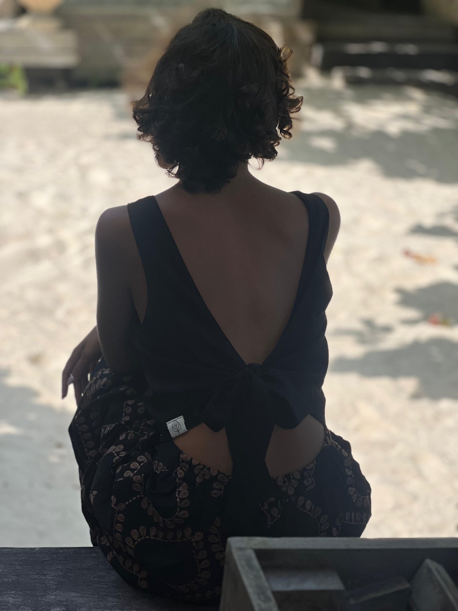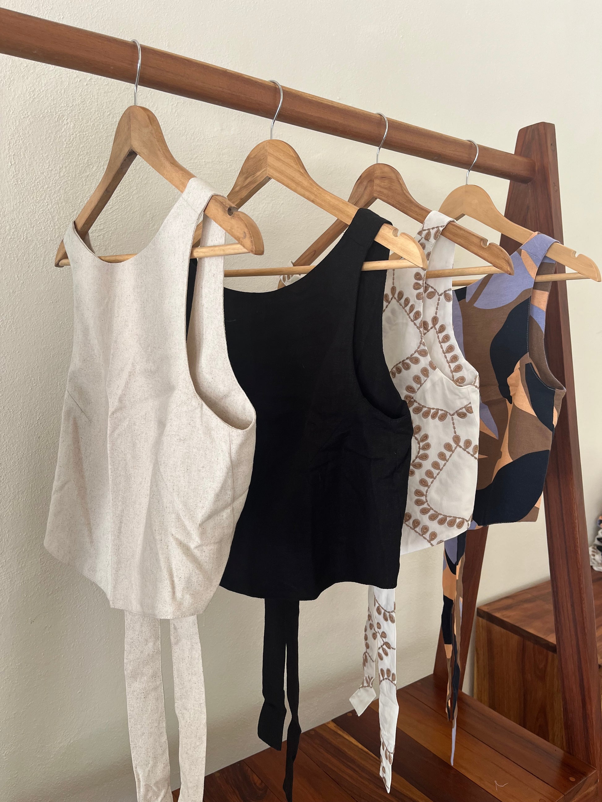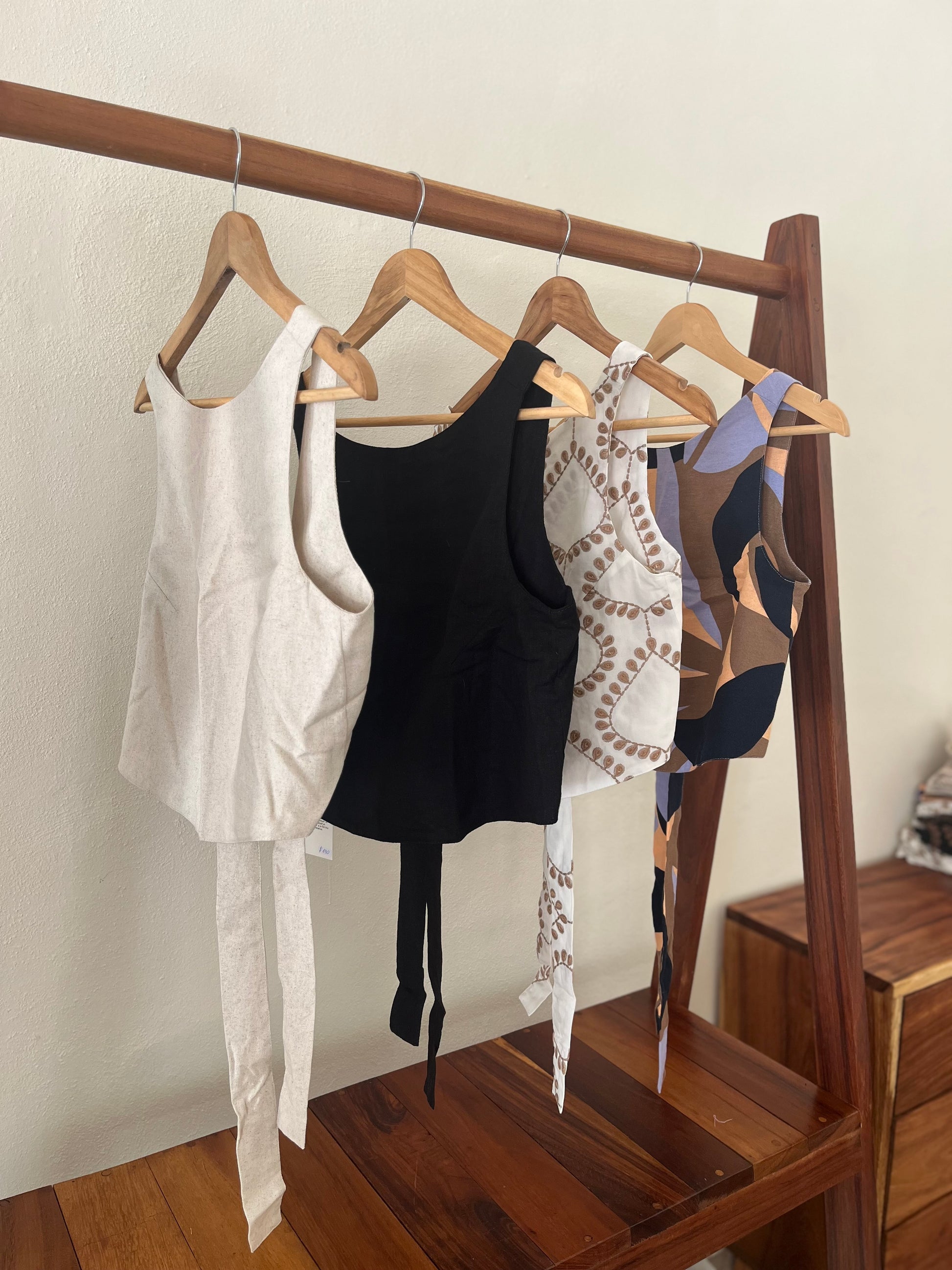 Blusa de lino con doble capa de tela, no se transparenta, con tiras para anudar en la espalda y ajustarlo a tu medida.