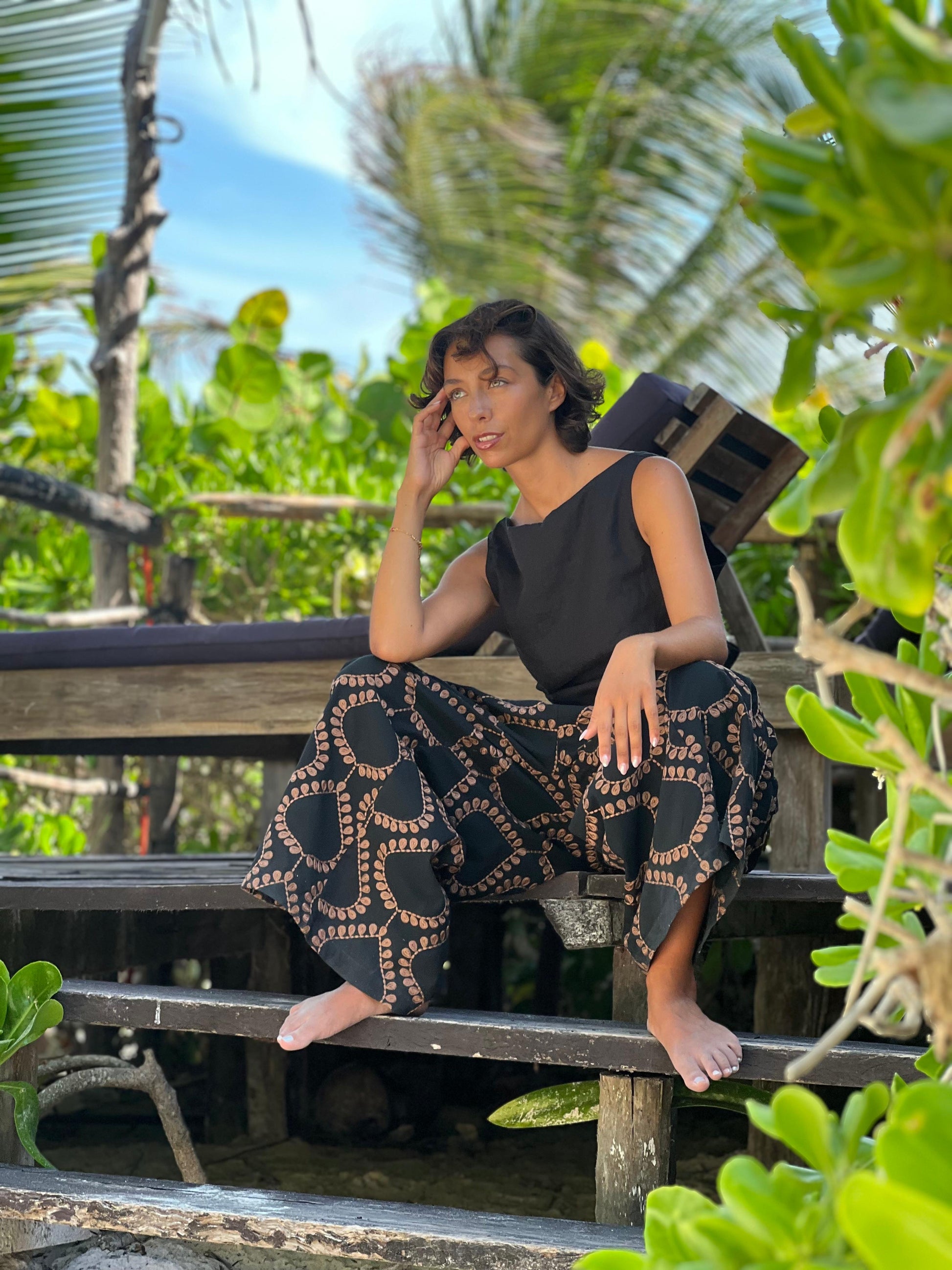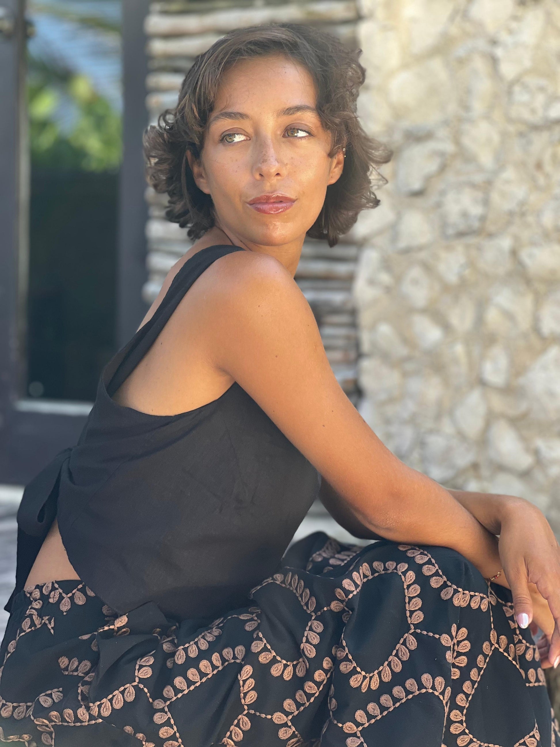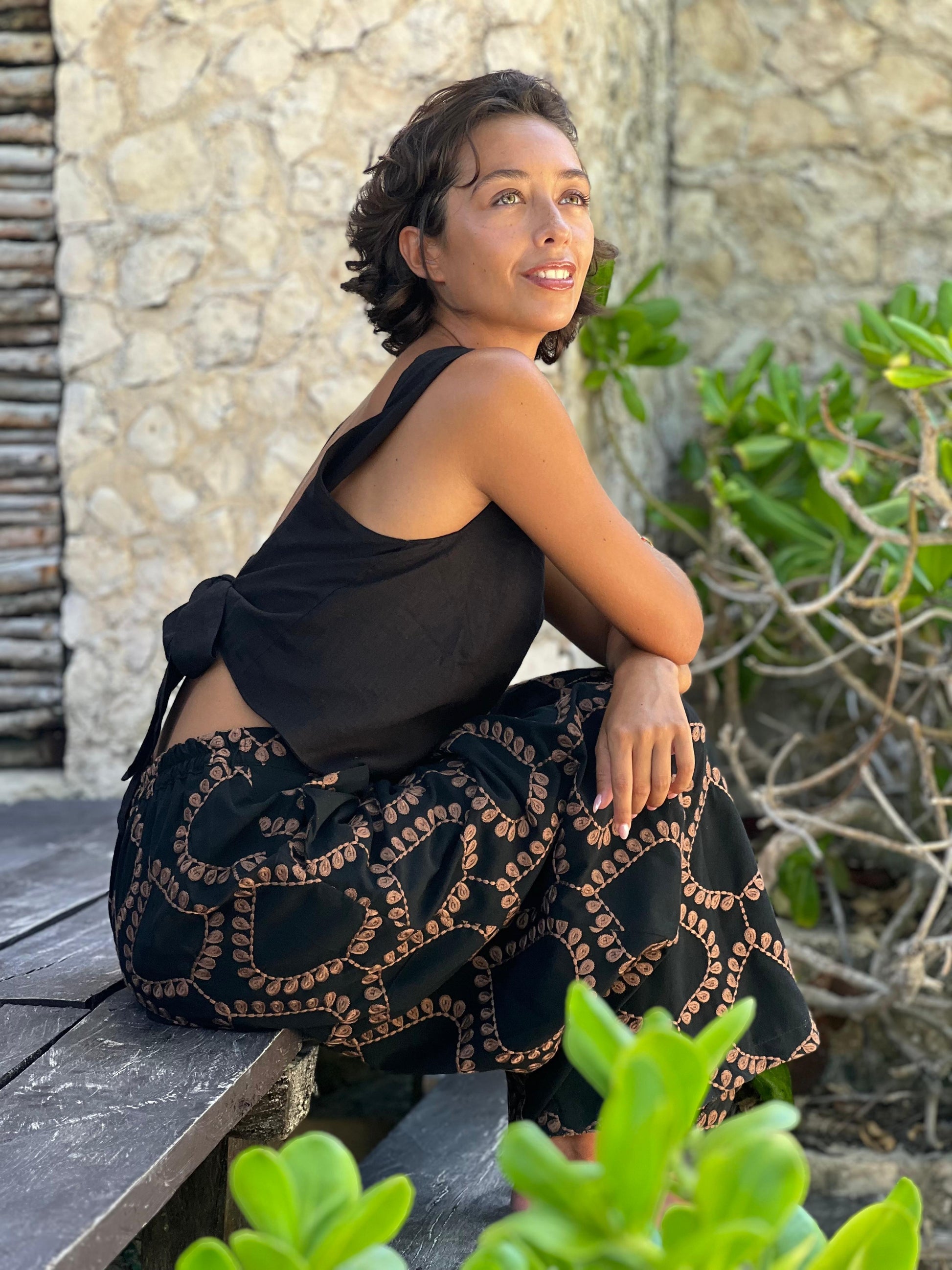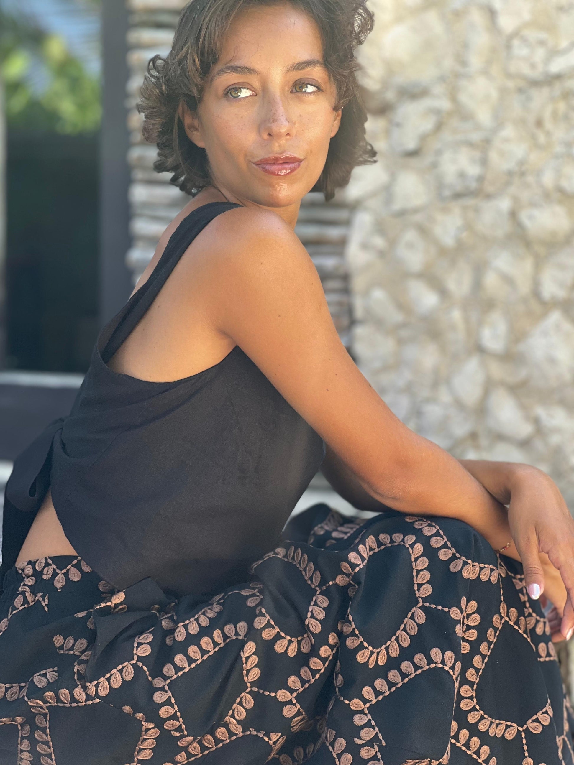 Blusa de lino con doble capa de tela, no se transparenta, con tiras para anudar en la espalda y ajustarlo a tu medida.