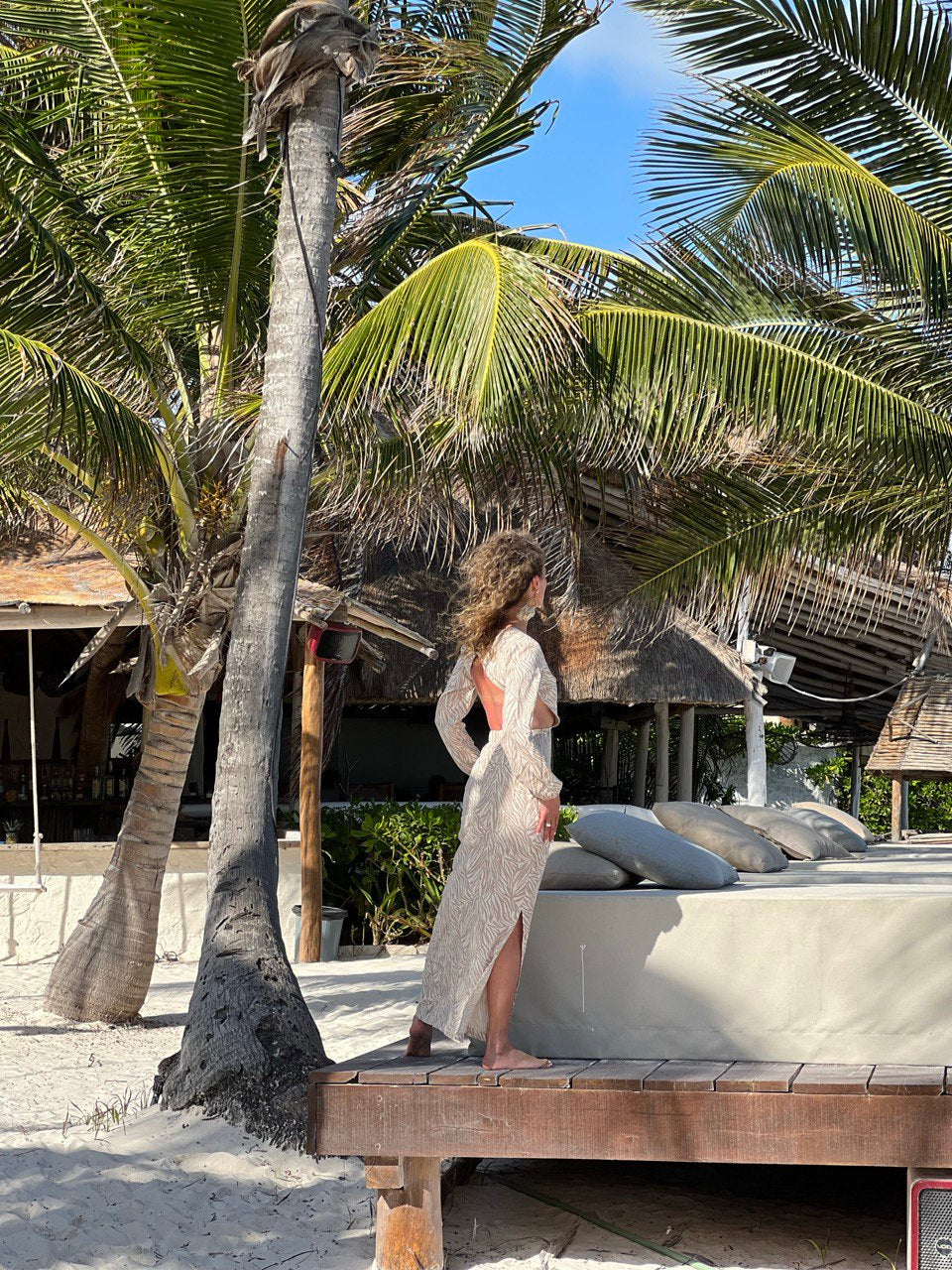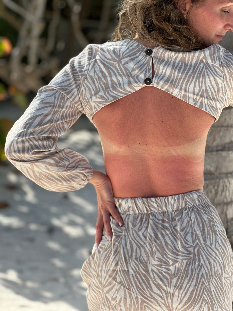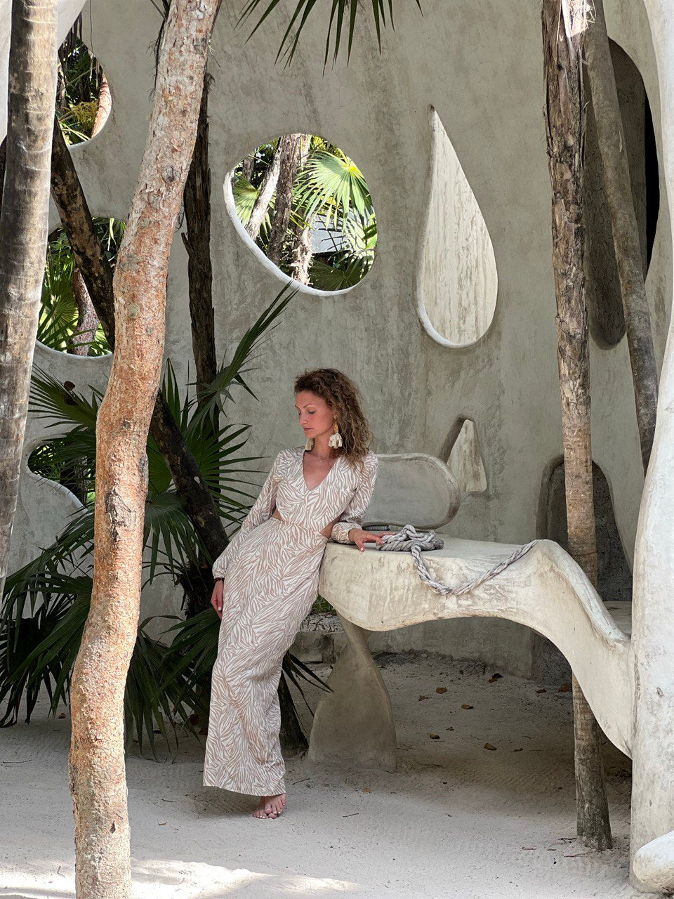 Vestido de lino estampado en cebra beige, con mangas largas y espalda abierta, resorte en cintura, cierre invisible y escote en V al frente.