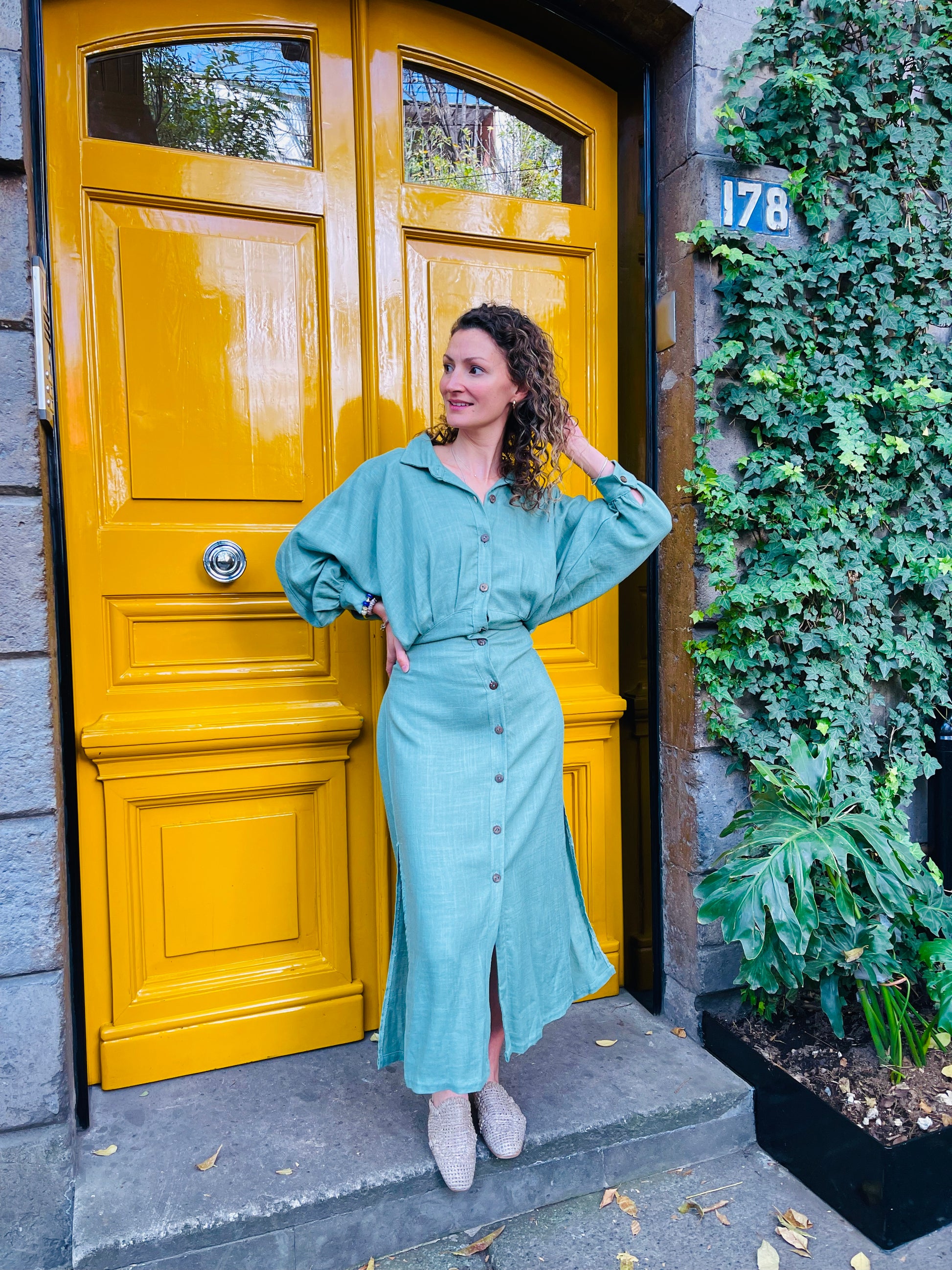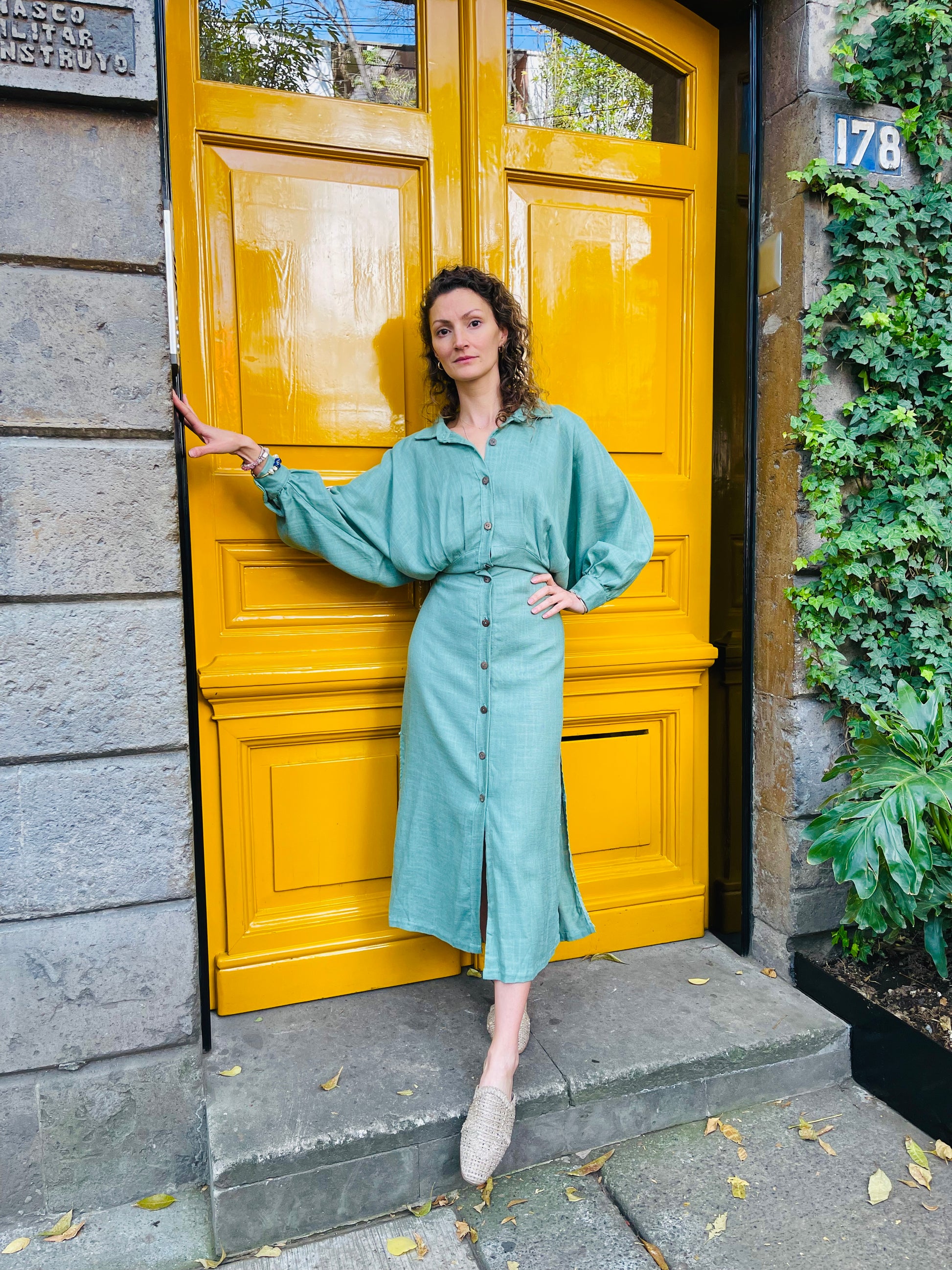 Vestido en lino color verde menta oscuro, escote en V con mangas mariposa, pinzas en la cintura y lazo para ajustar en espalda o al frente. Vestido largo con botones de coco al frente.