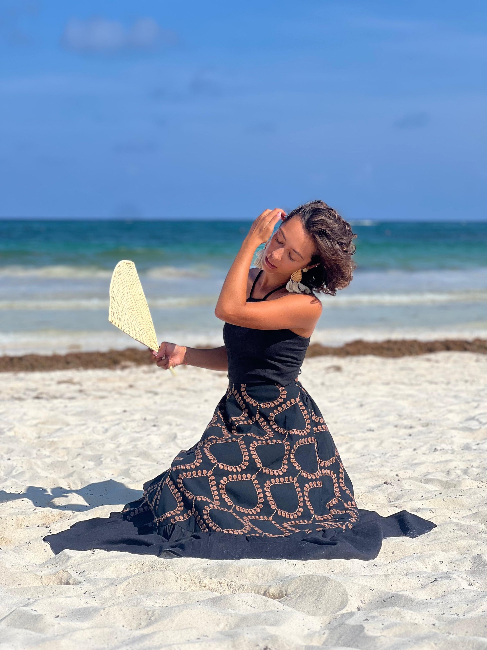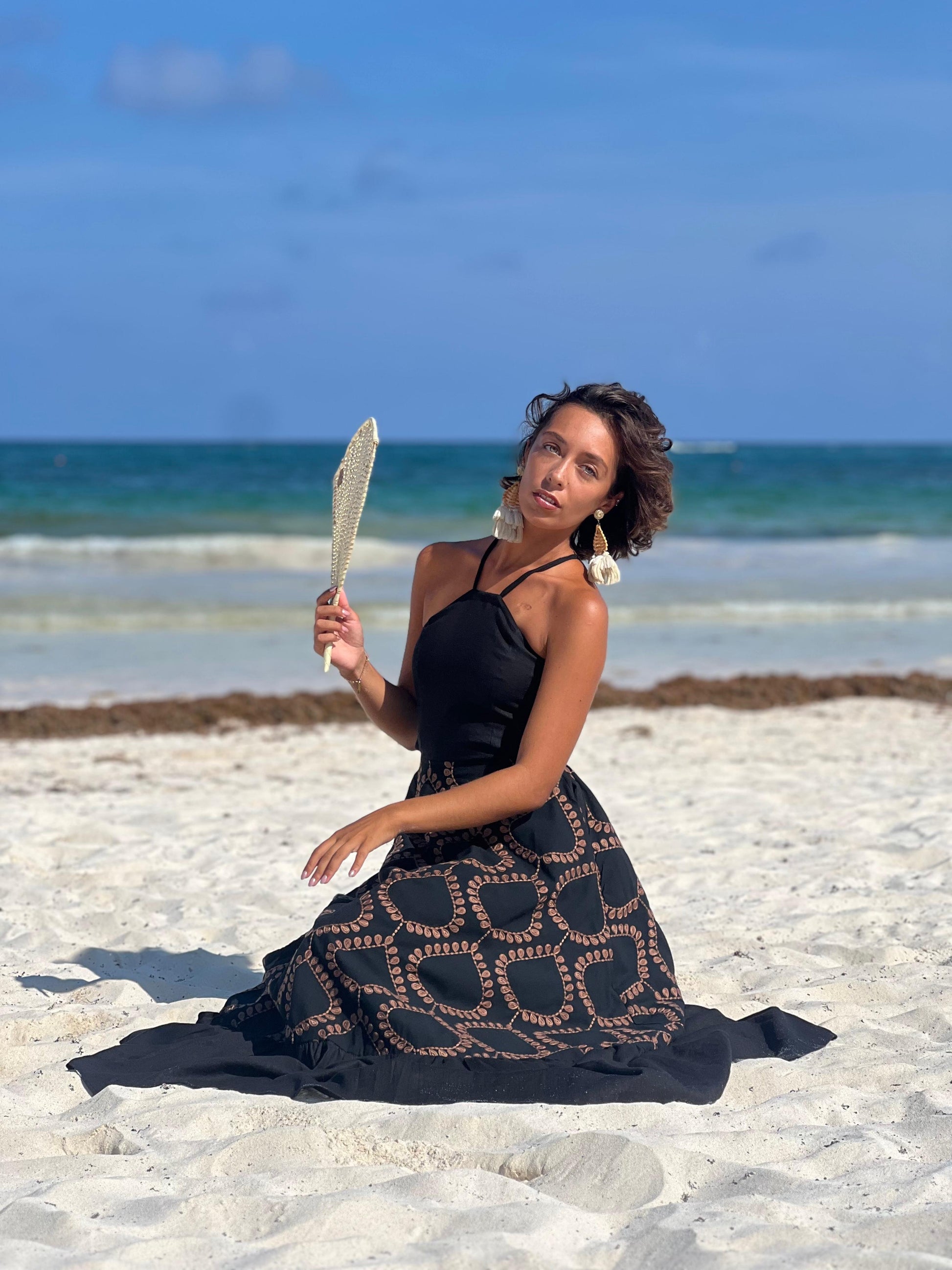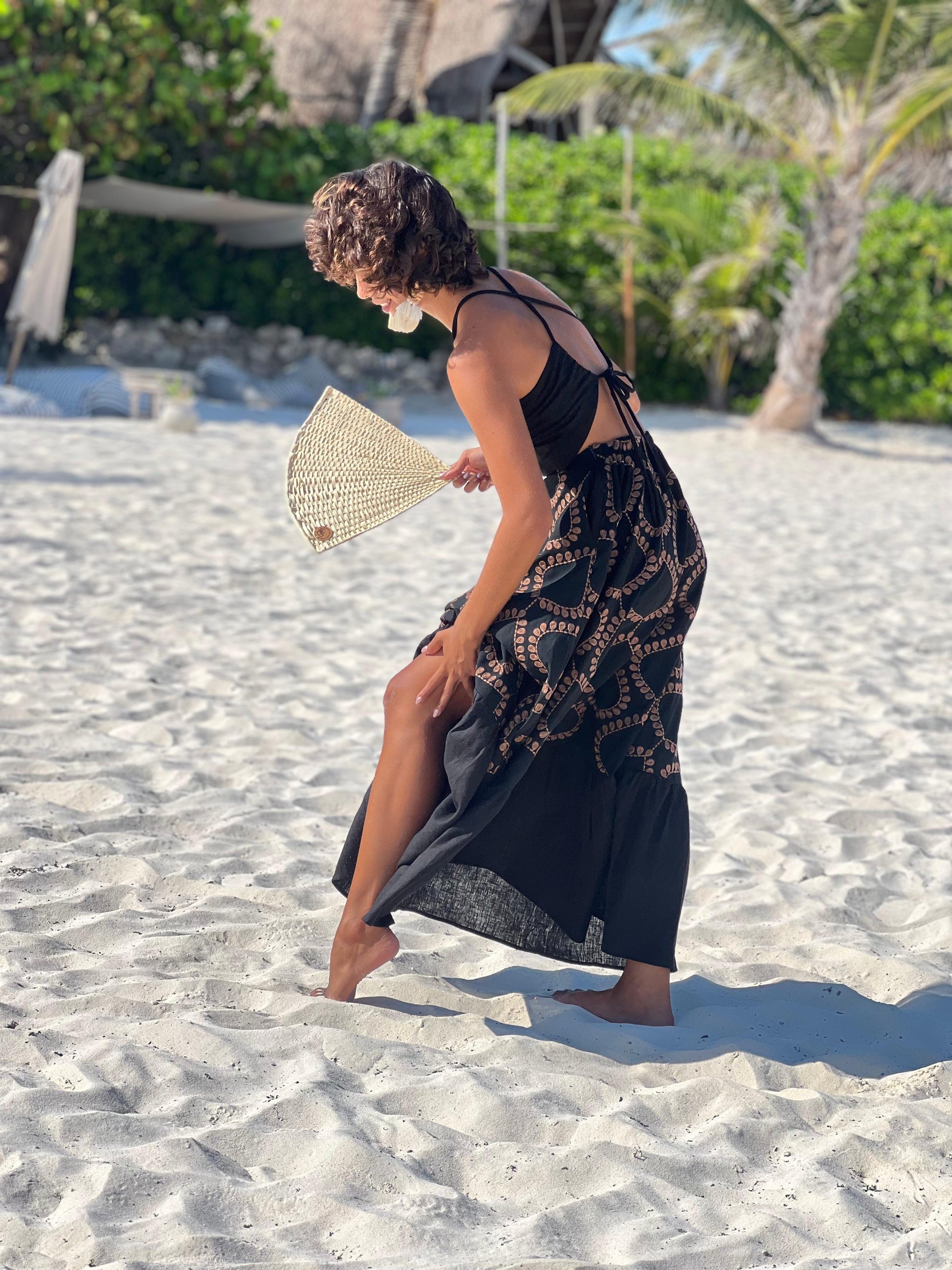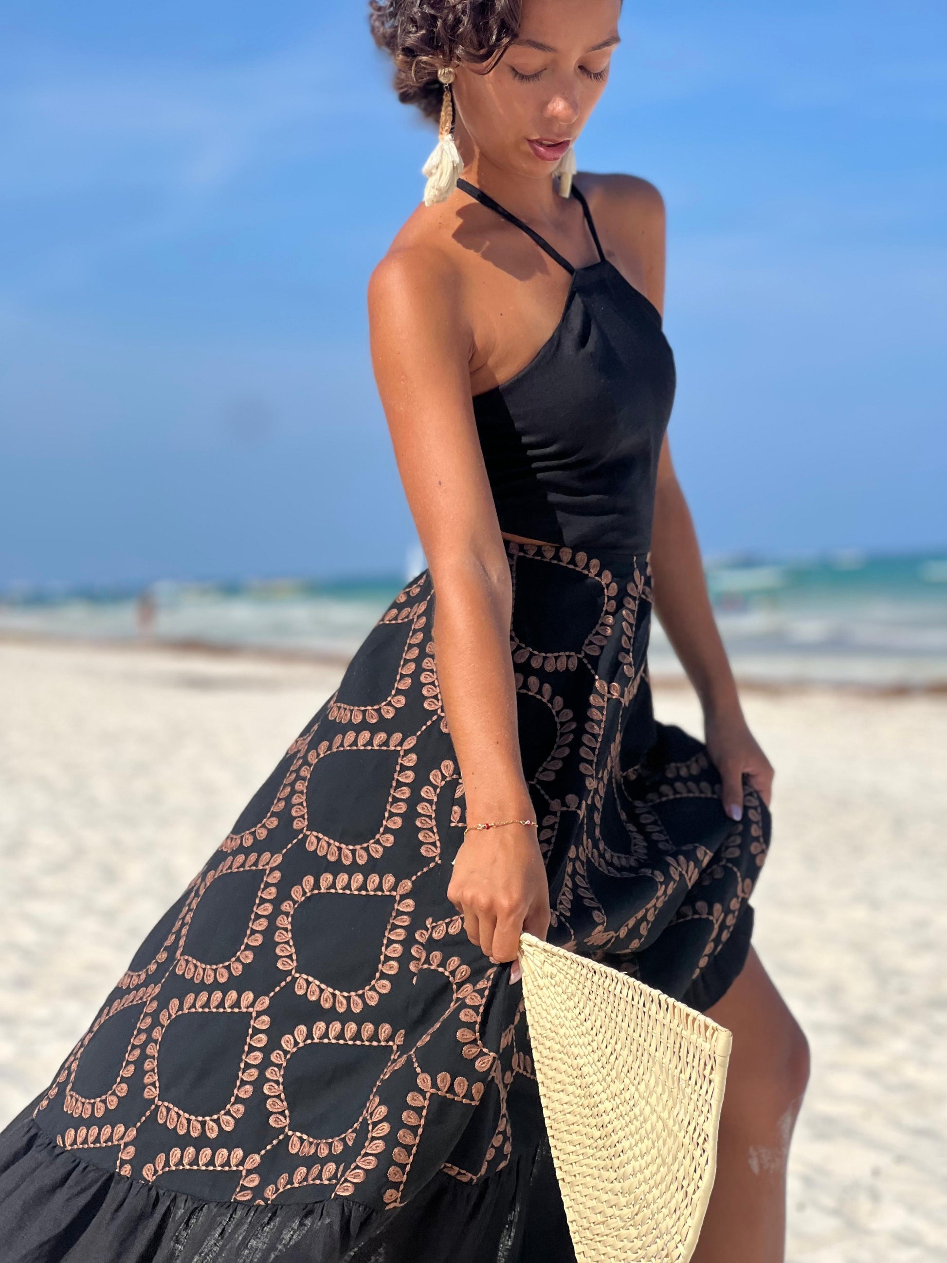 confeccionado en lino y la sección del bordado en algodón, por lo que es fresco, con movimiento, ajustable en la espalda, además tiene bolsas invisibles que lo hacen ideal para cargar esas pequeñas cosas esenciales sin necesidad de llevar nada más.